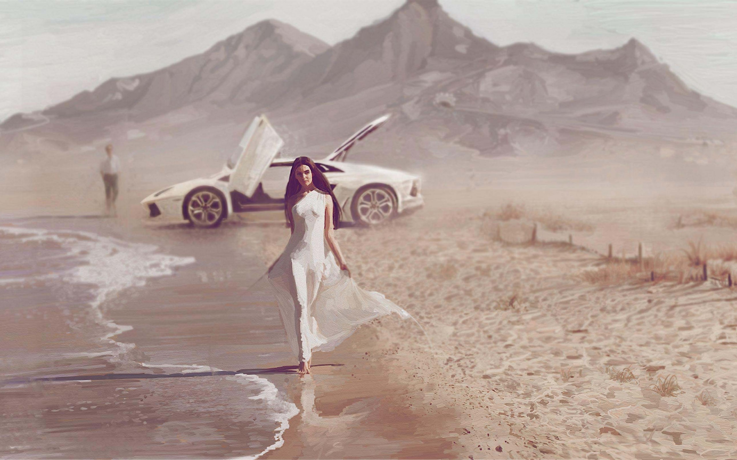 Description: A woman in a white dress walking on a beach next to a car with a hood open and a man standing next to it.