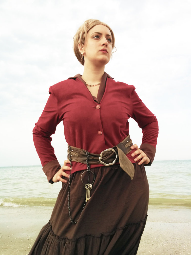 Description: A woman standing on a beach wearing a dress and belted shirt with a belt around her waist and a red shirt with a brown collar.