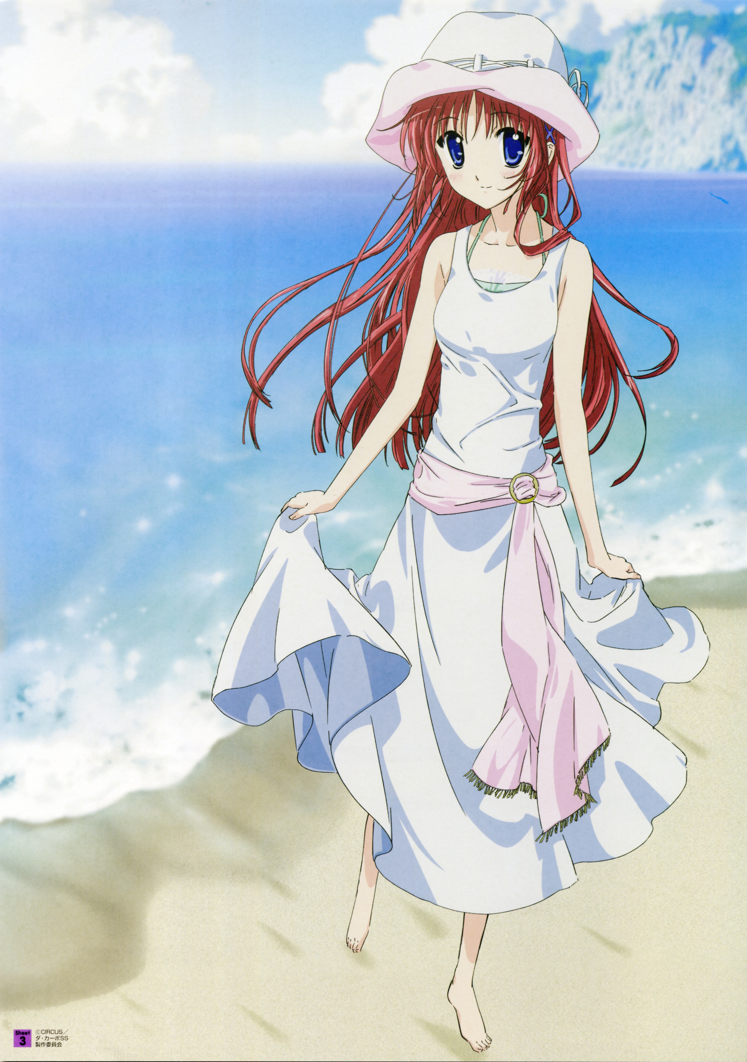 Description: A woman in a white dress and hat on a beach with a pink ribbon around her neck and long red hair.