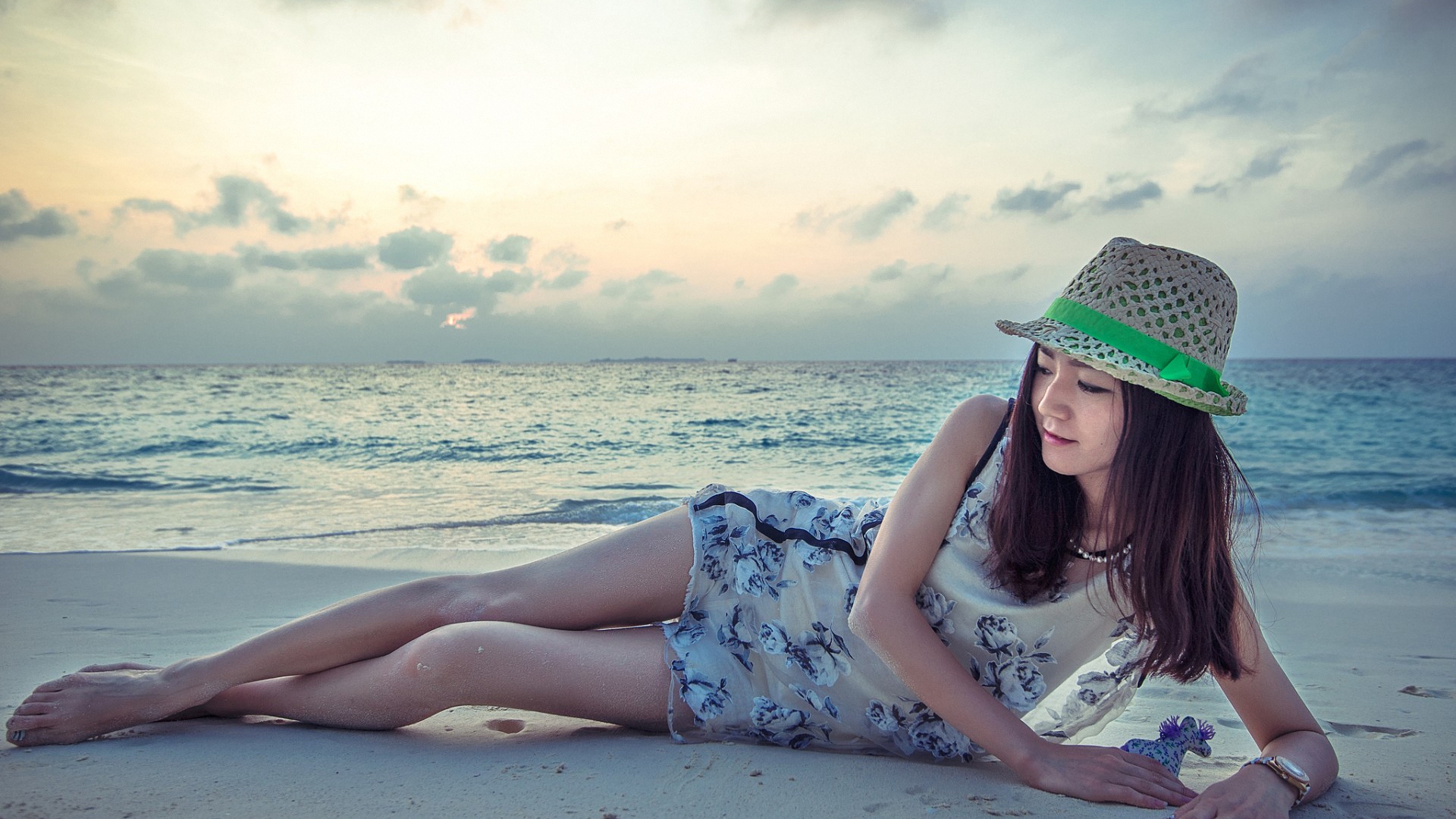 Description: A woman sitting on the beach wearing a hat and dress with a flower in her hand and a green and white hat.