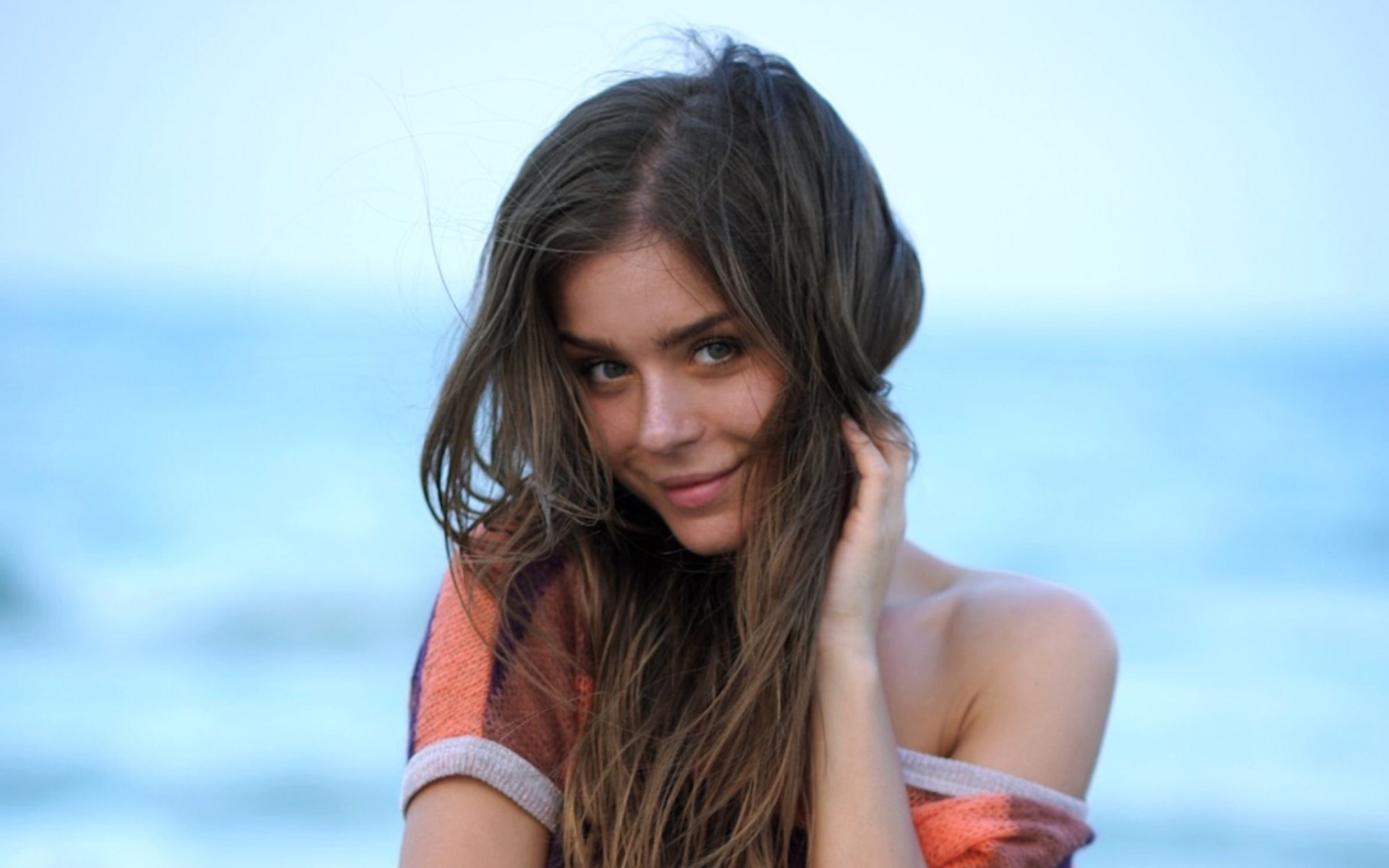 Description: A woman with long hair standing on the beach with her hand on her head and looking at the camera.