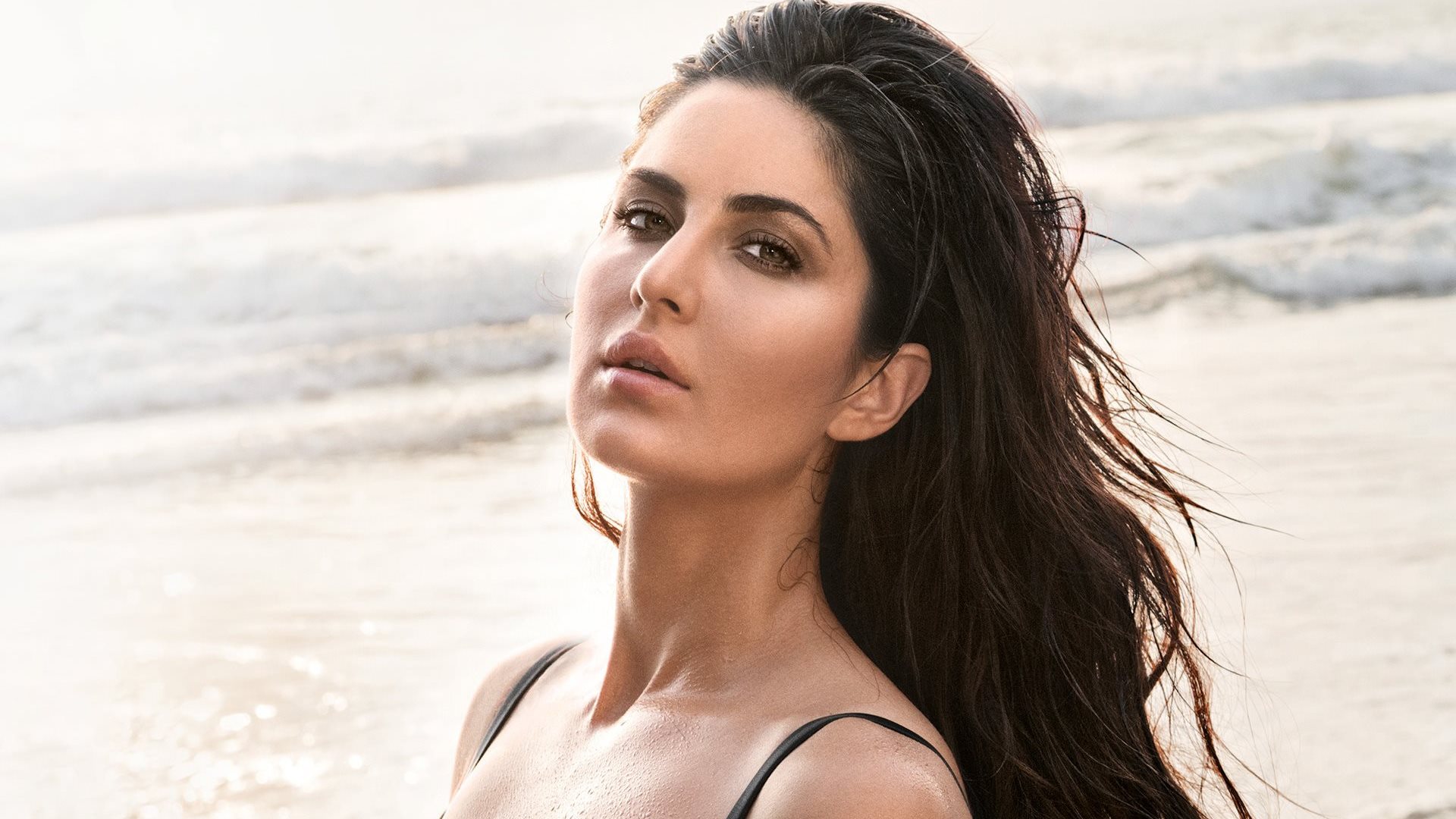 Description: A woman with long hair standing on the beach looking off into the distance with waves in the background and a body of water in the foreground.