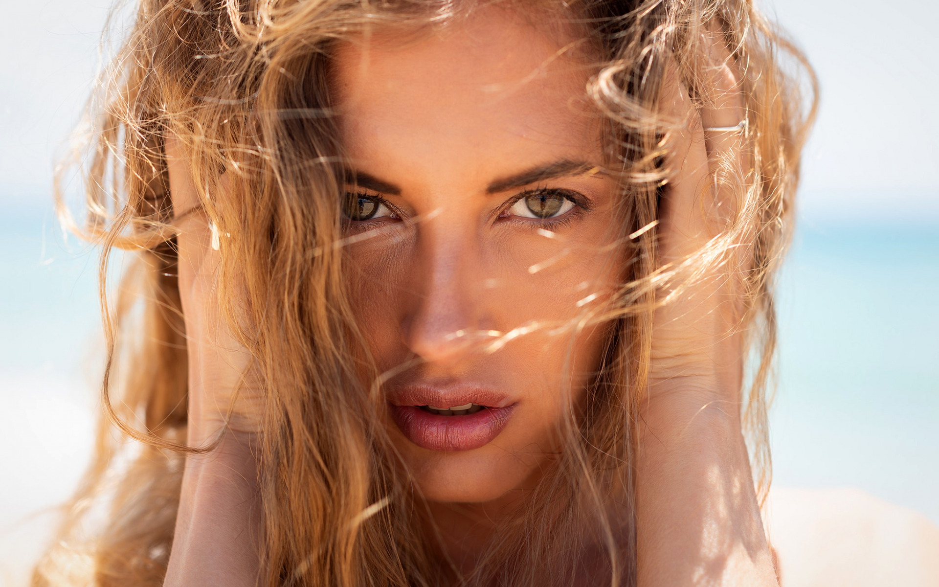Description: A woman with long hair is posing for a picture on the beach with her hands on her head and her eyes open.