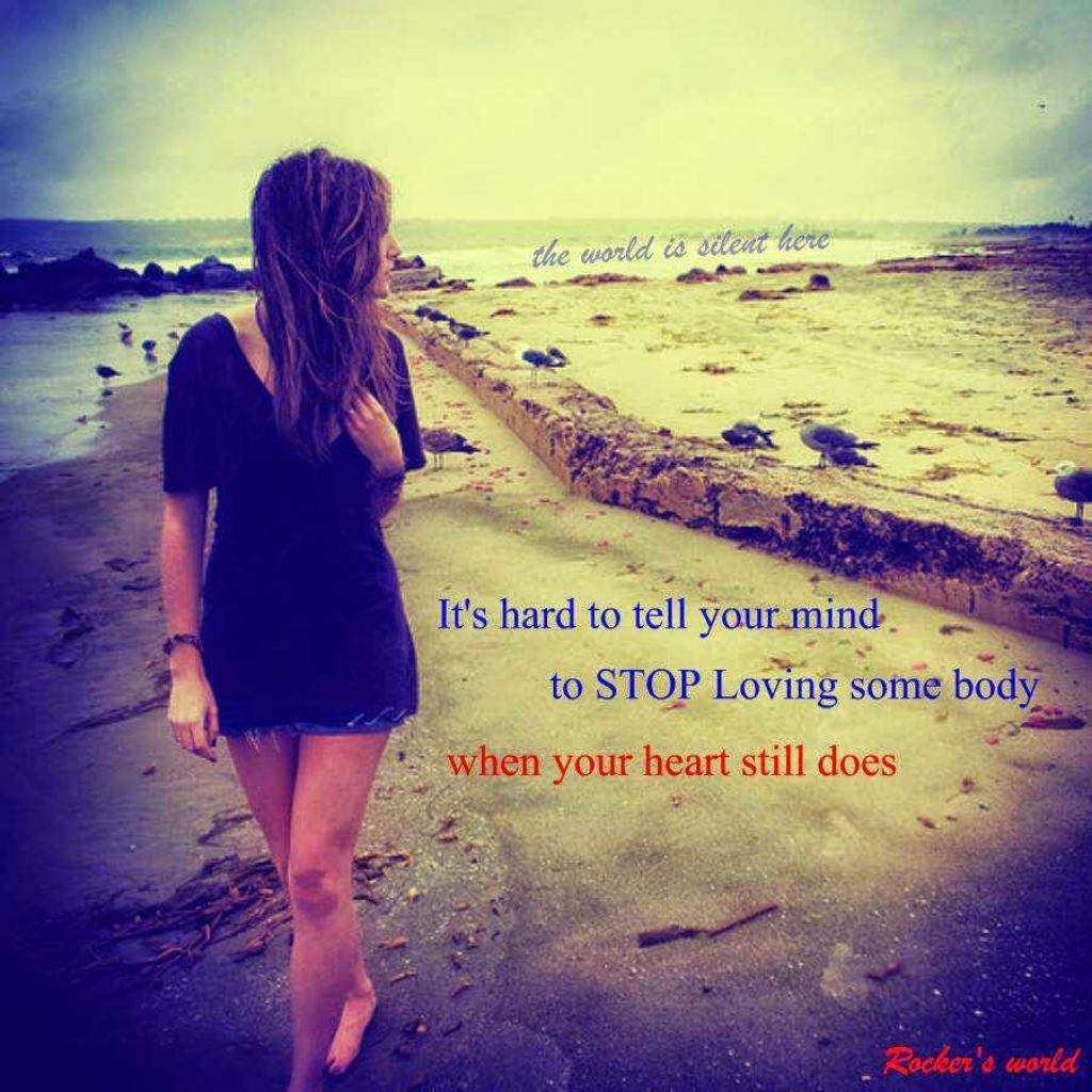 Description: A woman walking on a beach with a quote about it's hard to tell your mind to stop loving someone.