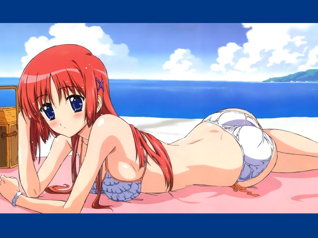 Description: A woman laying on a beach next to a suitcase and a suitcase case with a blue sky in the background.