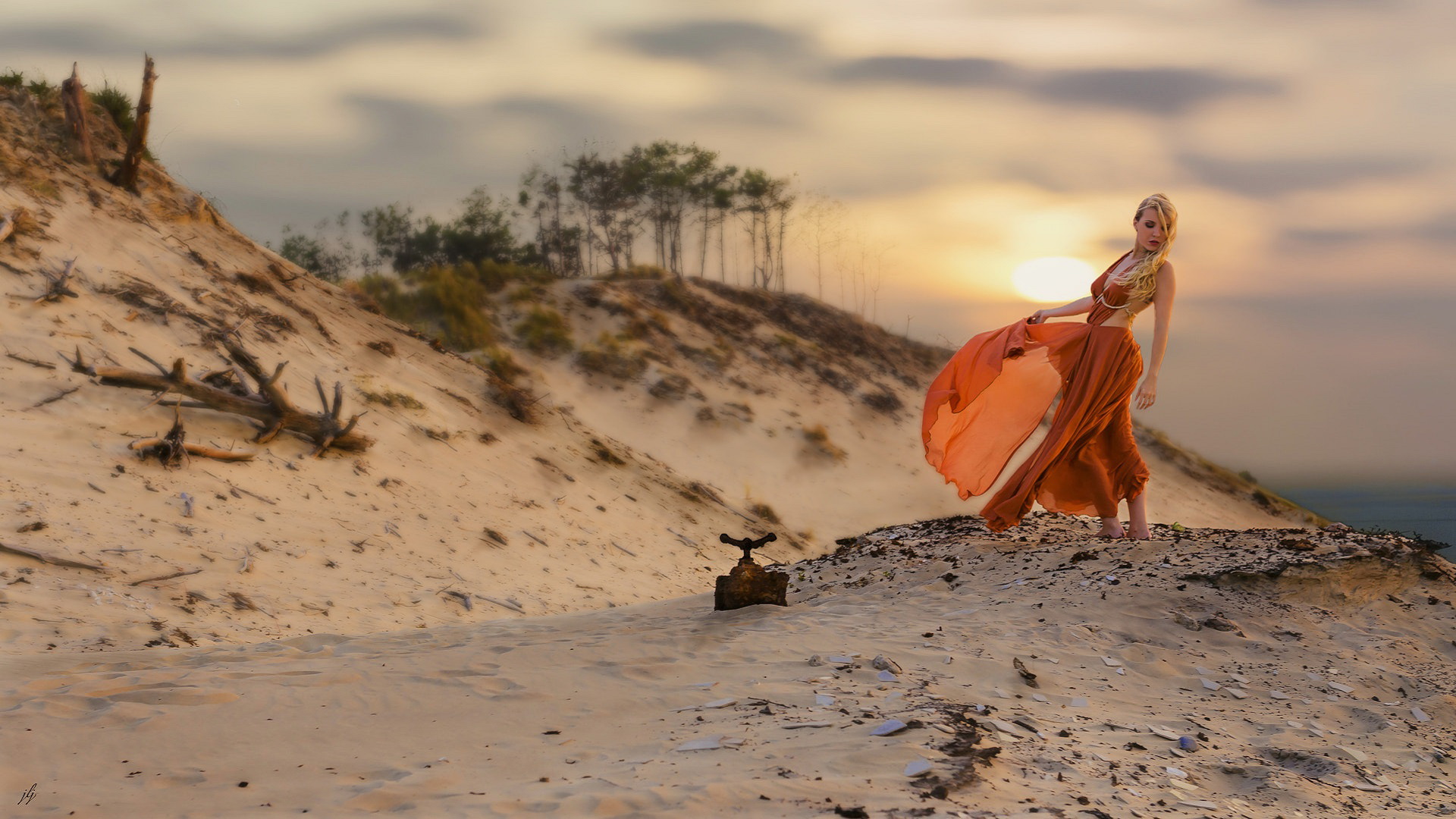 Description: A woman in a long dress standing on a beach at sunset with a frisbee in her hand.