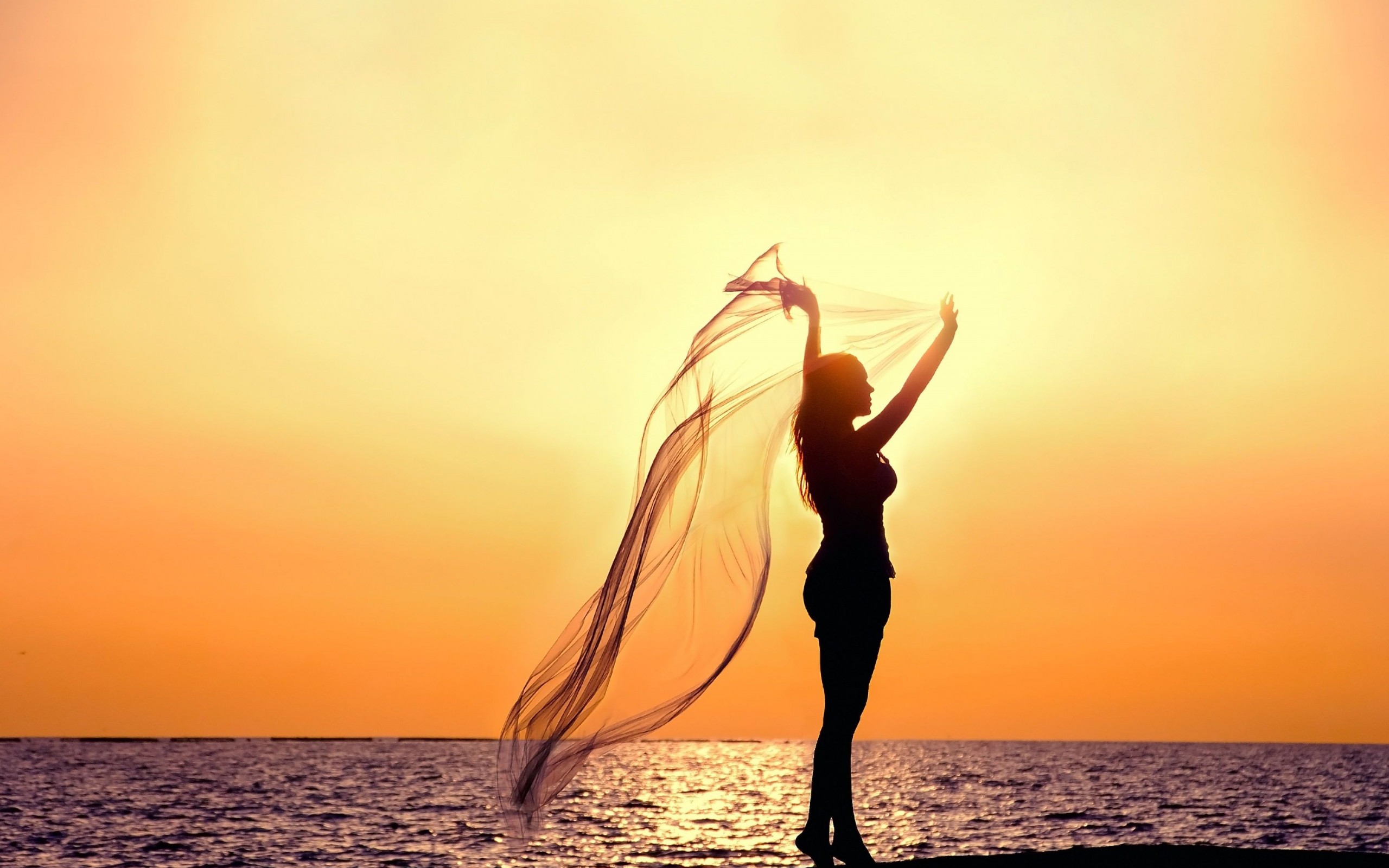 Description: A woman standing on a beach holding a sheer veil in front of the sun at sunset or sunset time.