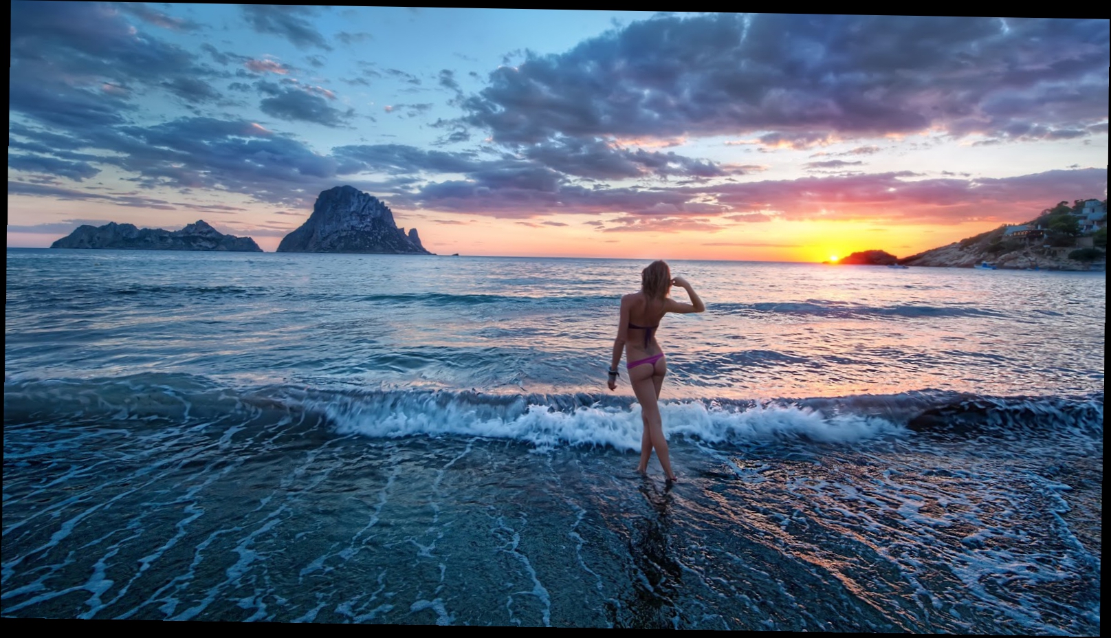 Description: A woman standing on the beach at sunset with a body of water in the foreground and a rock formation in the background.
