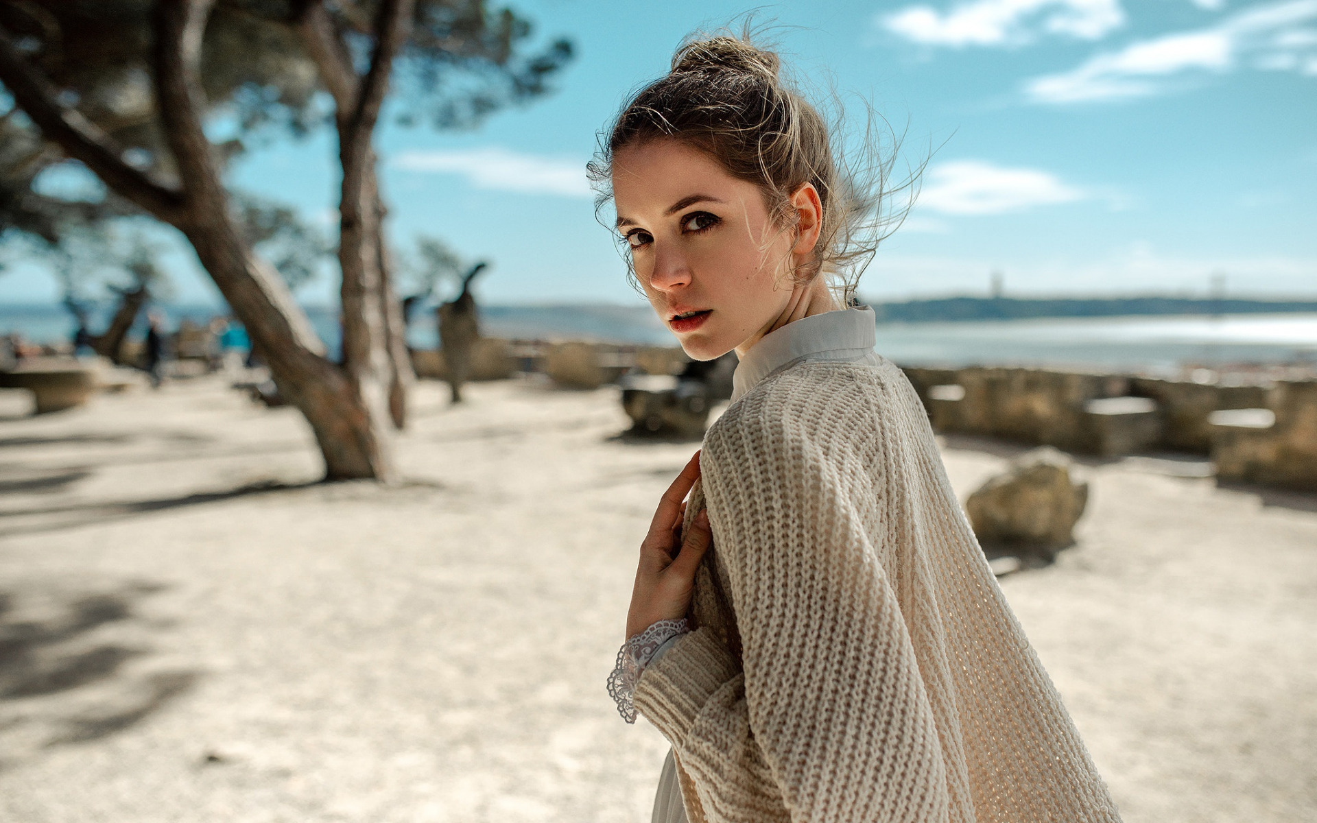 Description: A woman standing on a beach next to a tree and a body of water with a bridge in the background.
