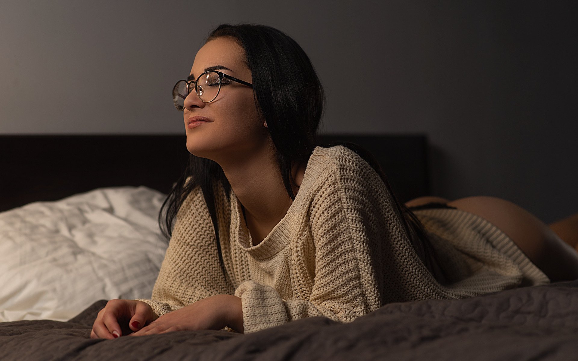 Description: A woman laying on a bed with a blanket on it's side and a blanket on her back.