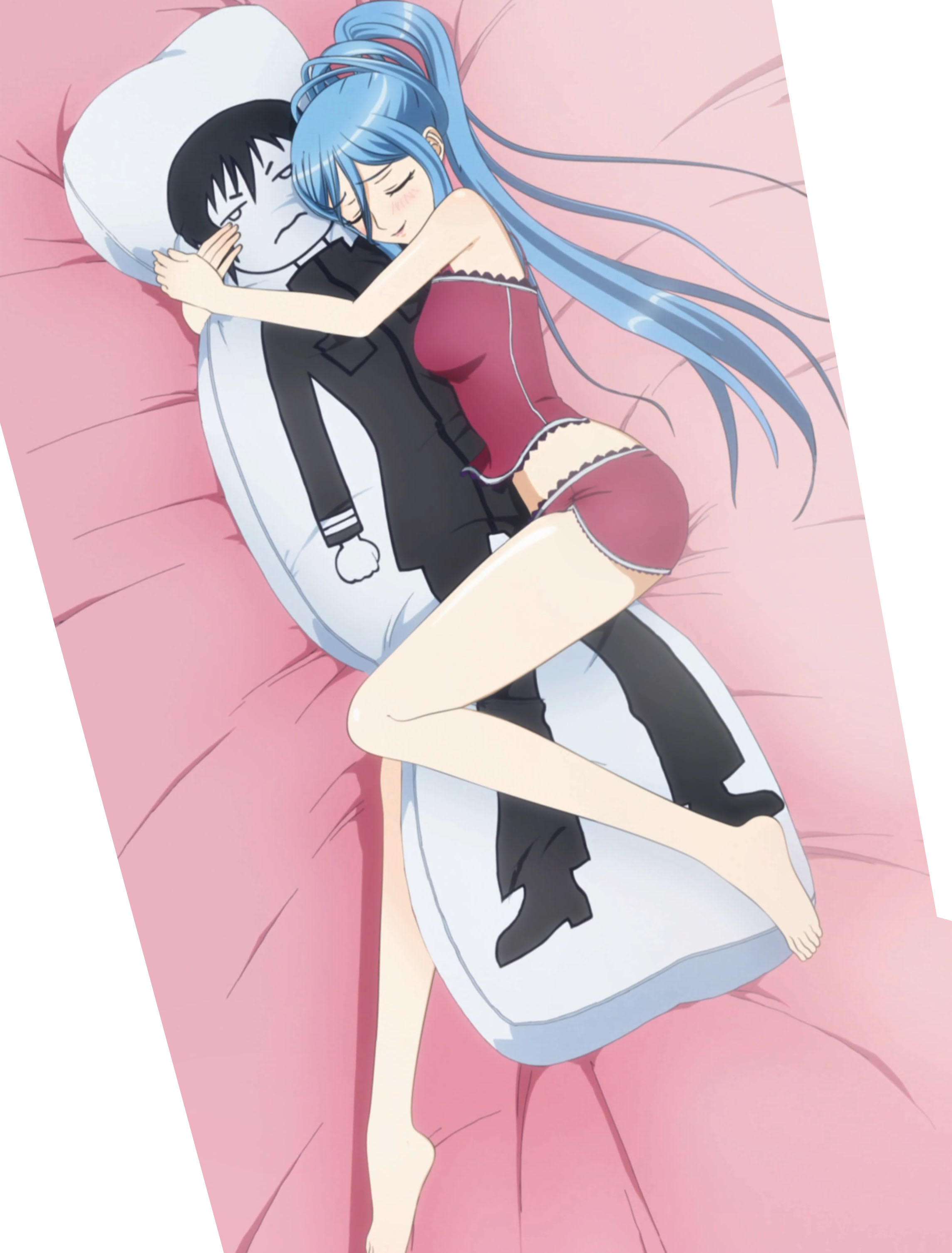 Description: A woman laying on a bed with a man in a black suit and a pink background with a pink background.