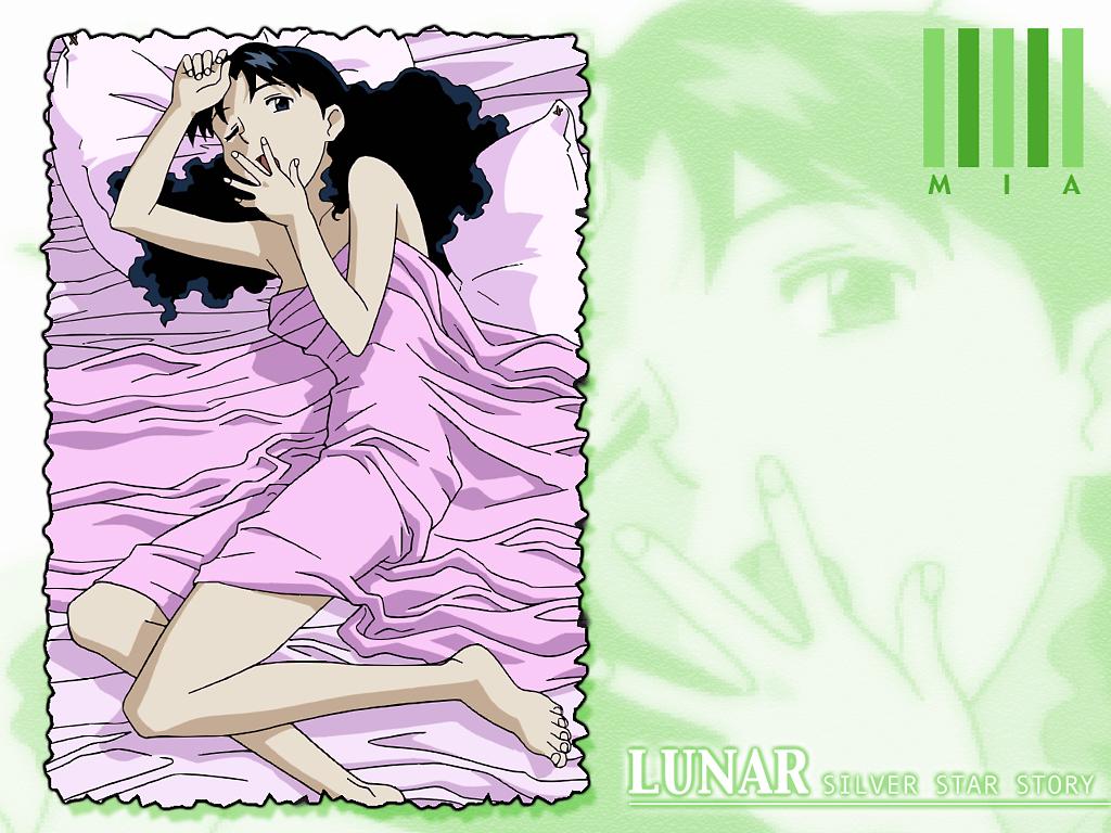Description: A woman laying in bed with a pink blanket on her back and a green background with a vertical line.
