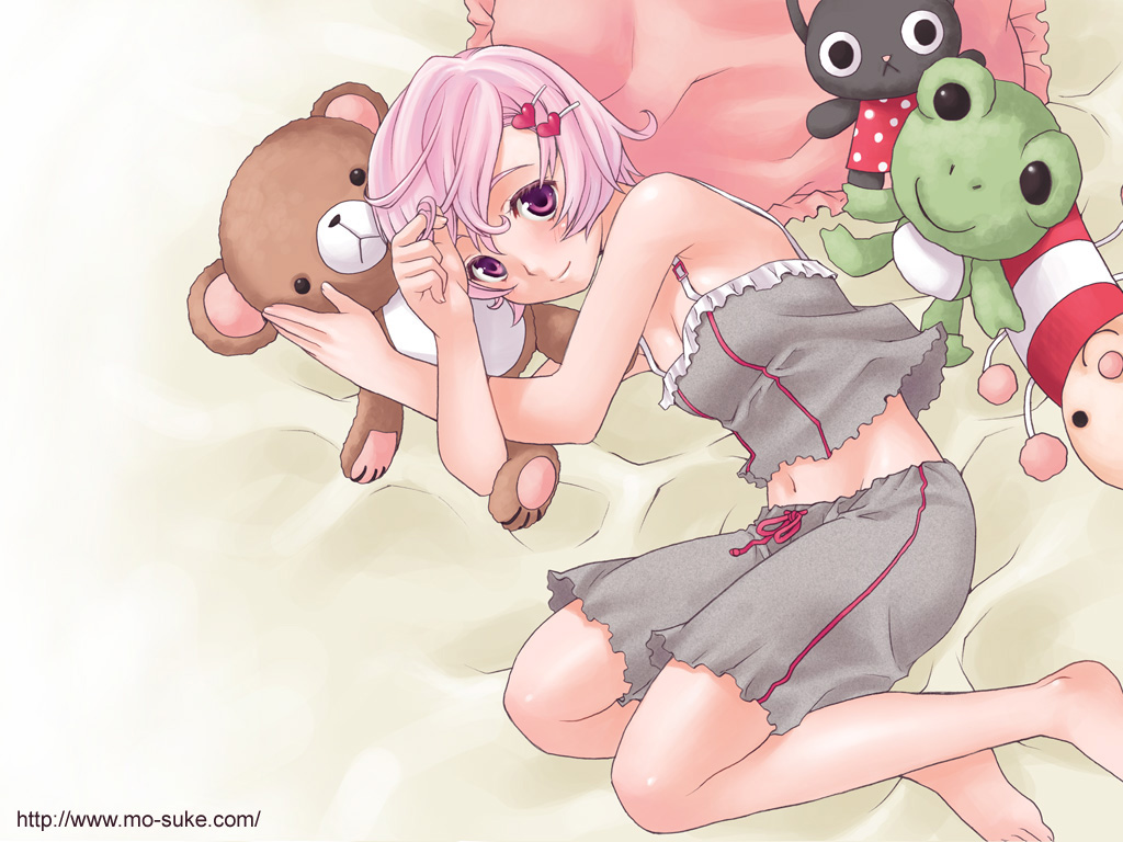 Description: A woman in a short skirt laying on a bed with stuffed animals and a teddy bear next to her.