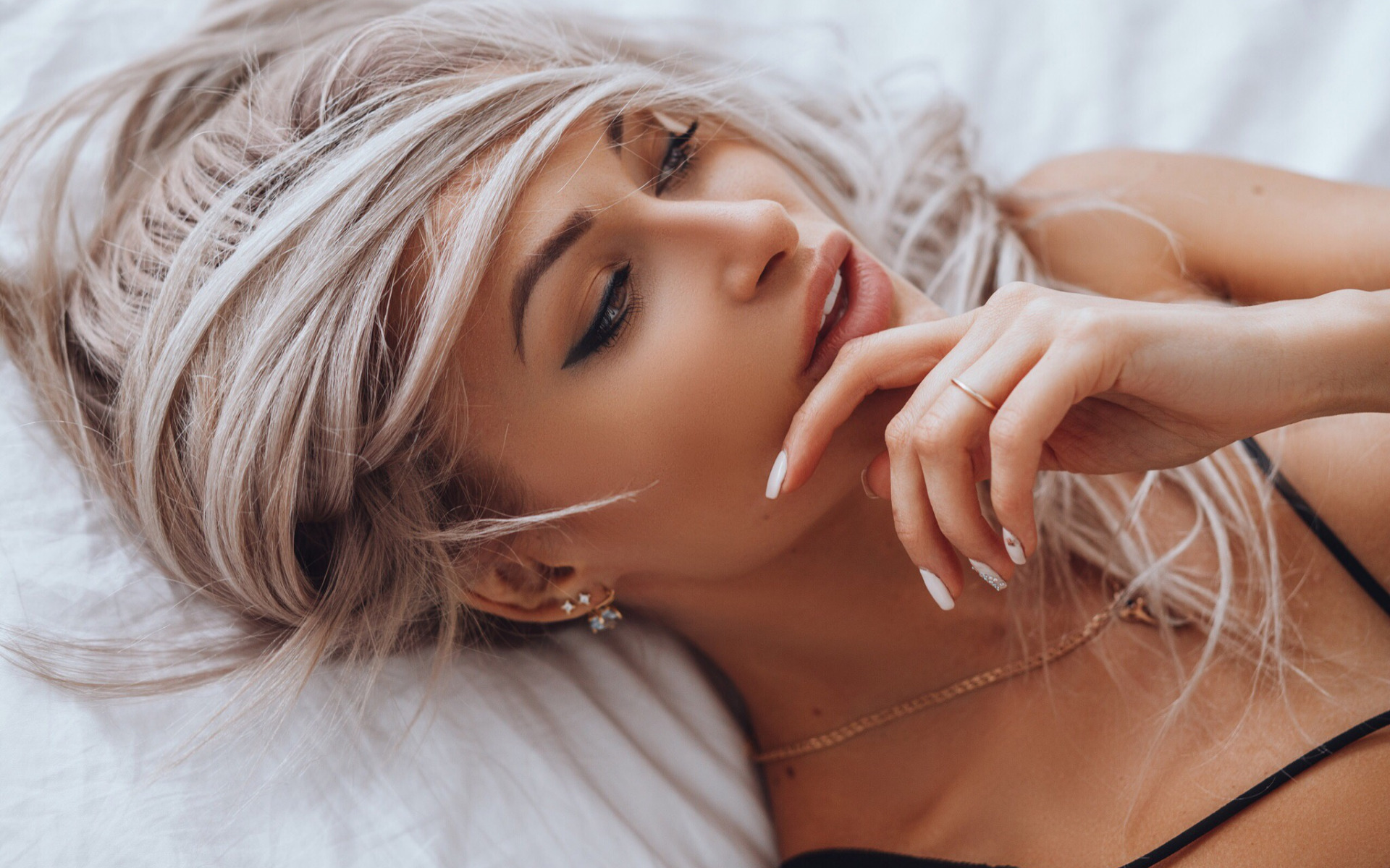 Description: A woman laying on a bed with her hand on her face and her hand on her cheek.