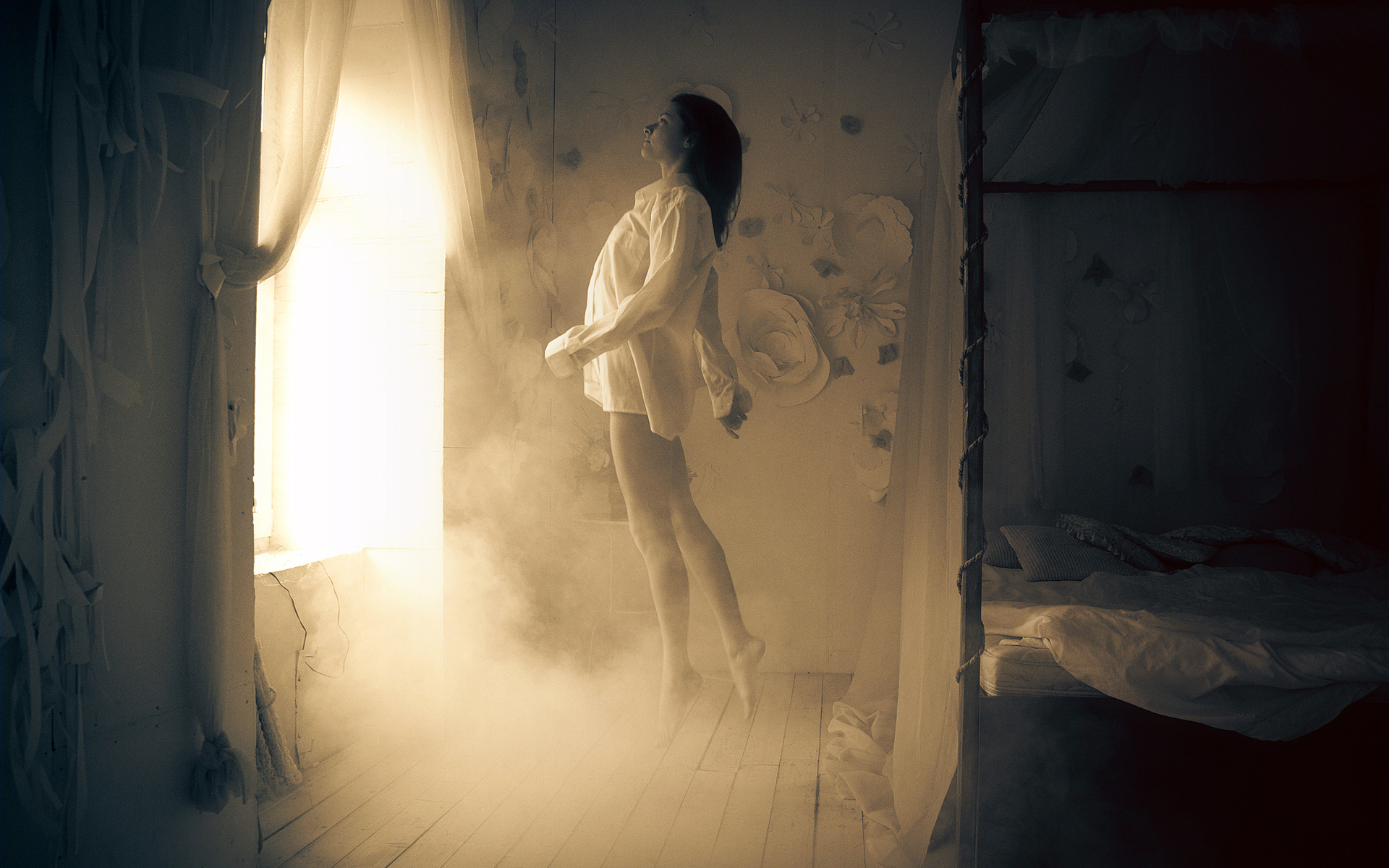 Description: A woman standing in a room with a bed and a window in the background and a fog coming from the floor.