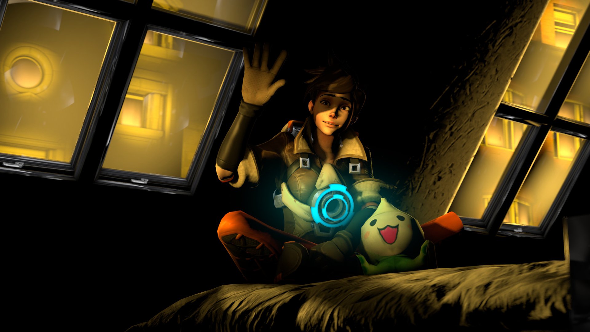 Description: A woman sitting on a bed next to a window with a glowing light on it and a stuffed animal.