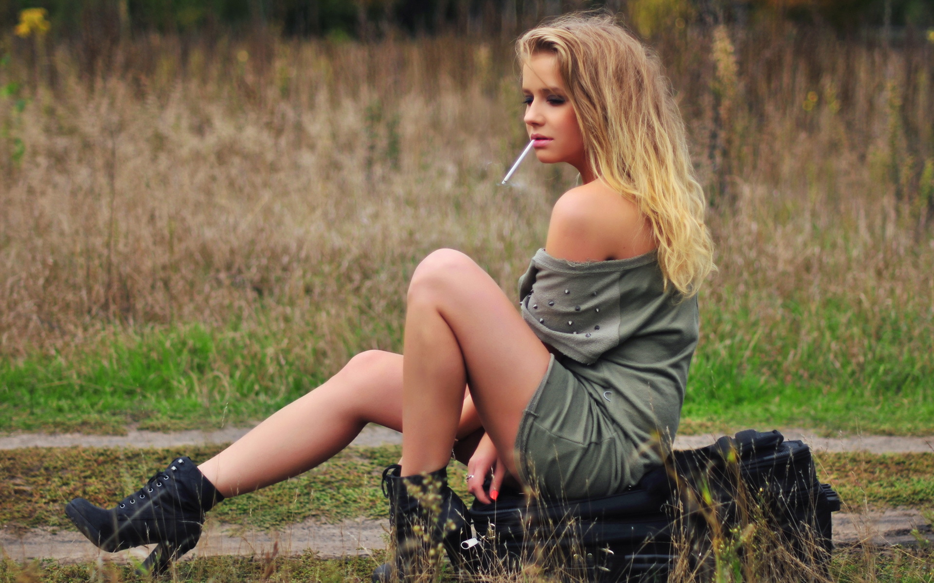 Description: A woman sitting on a bench with a cigarette in her mouth and a cigarette in her mouth.