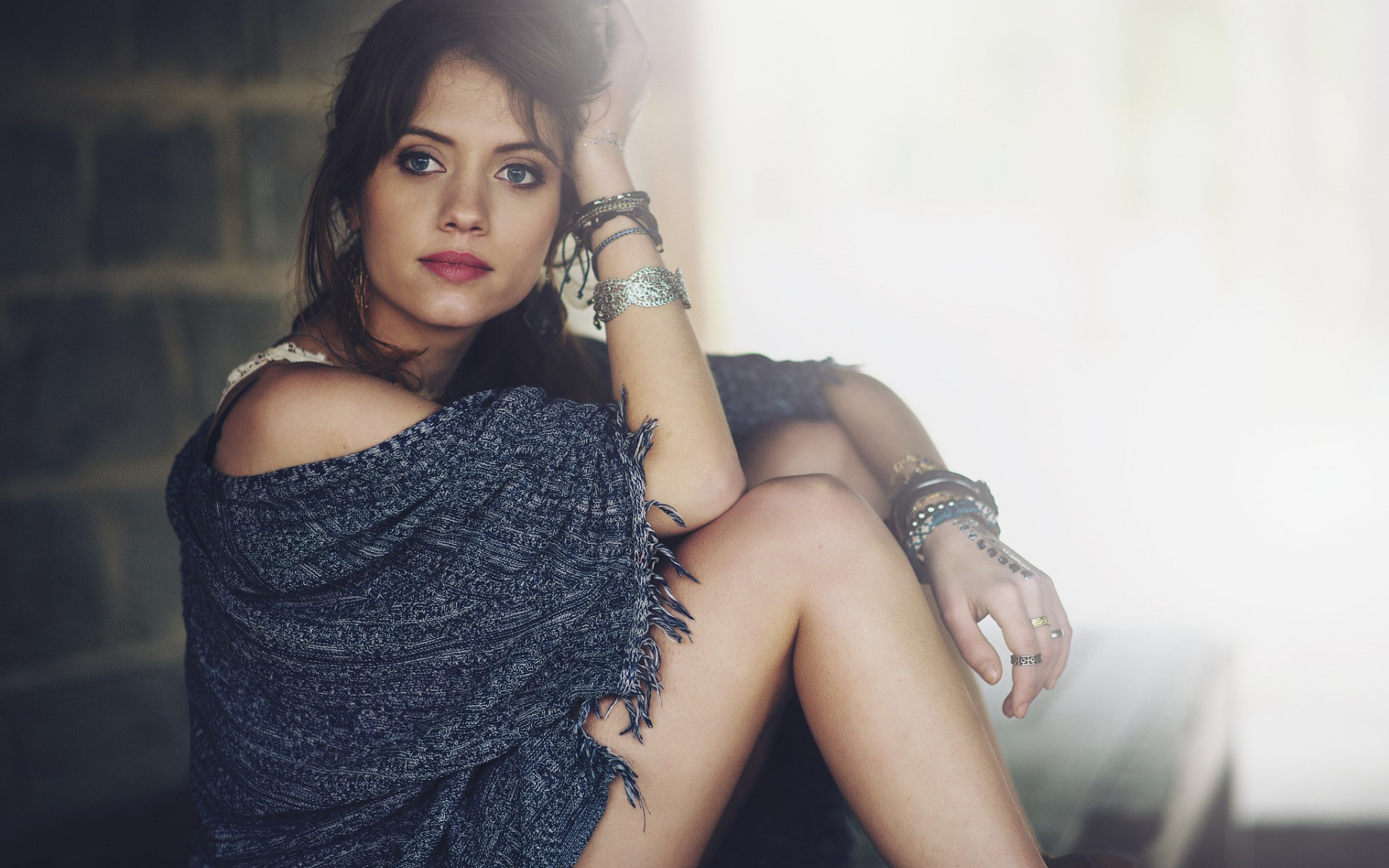 Description: A woman sitting on a bench with her legs crossed and her hand on her head.