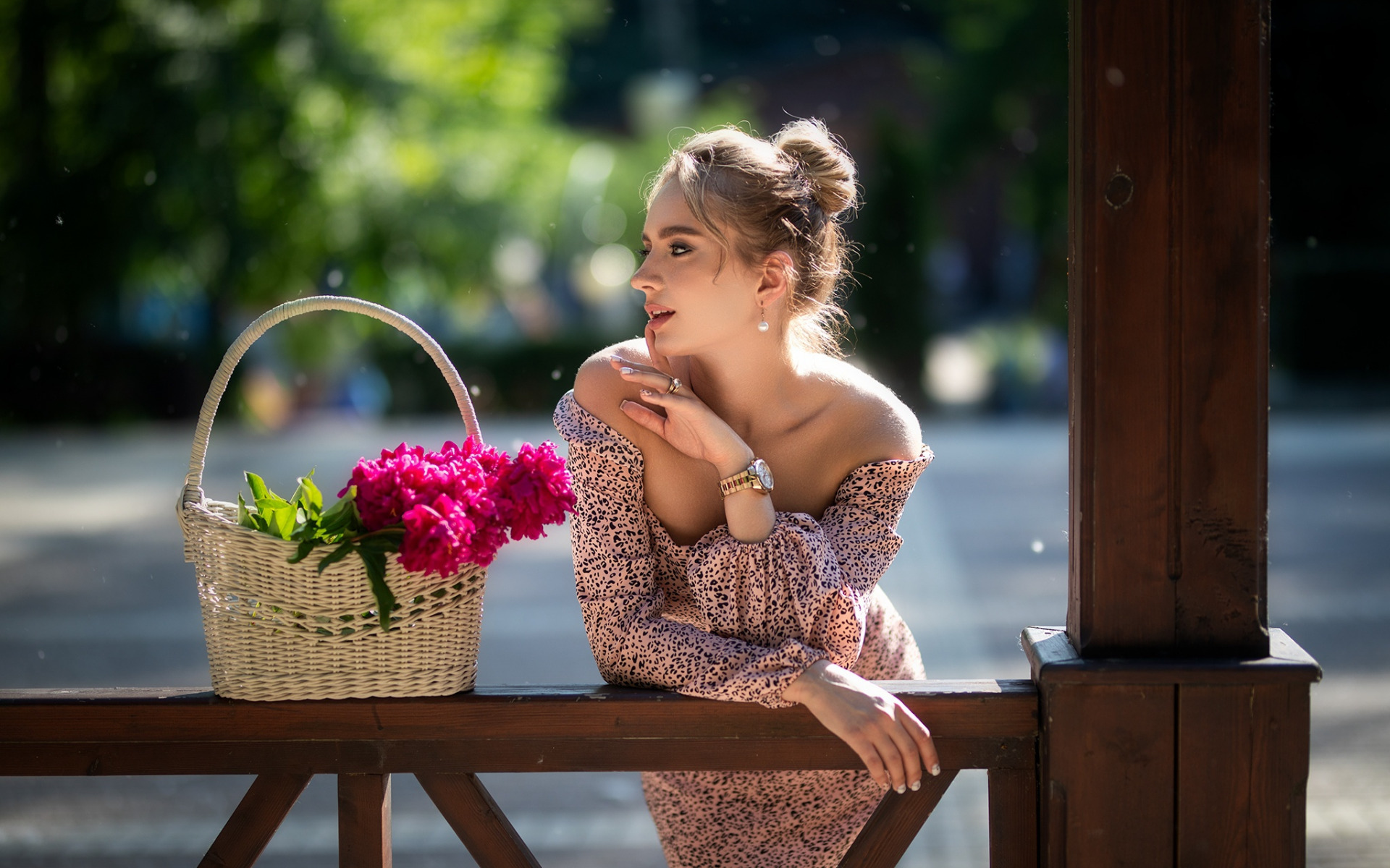 Description: A woman sitting on a bench with a basket of flowers in front of her and a basket of flowers in front of her.