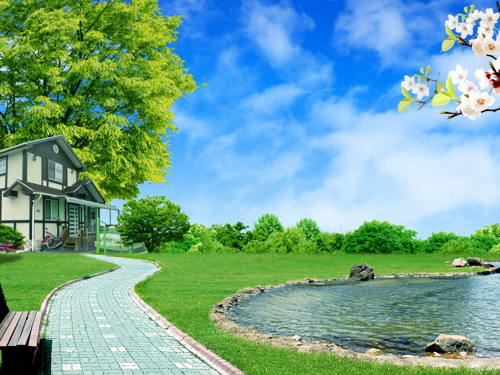 Description: A woman sitting on a bench in front of a house next to a lake and a house with a tree.