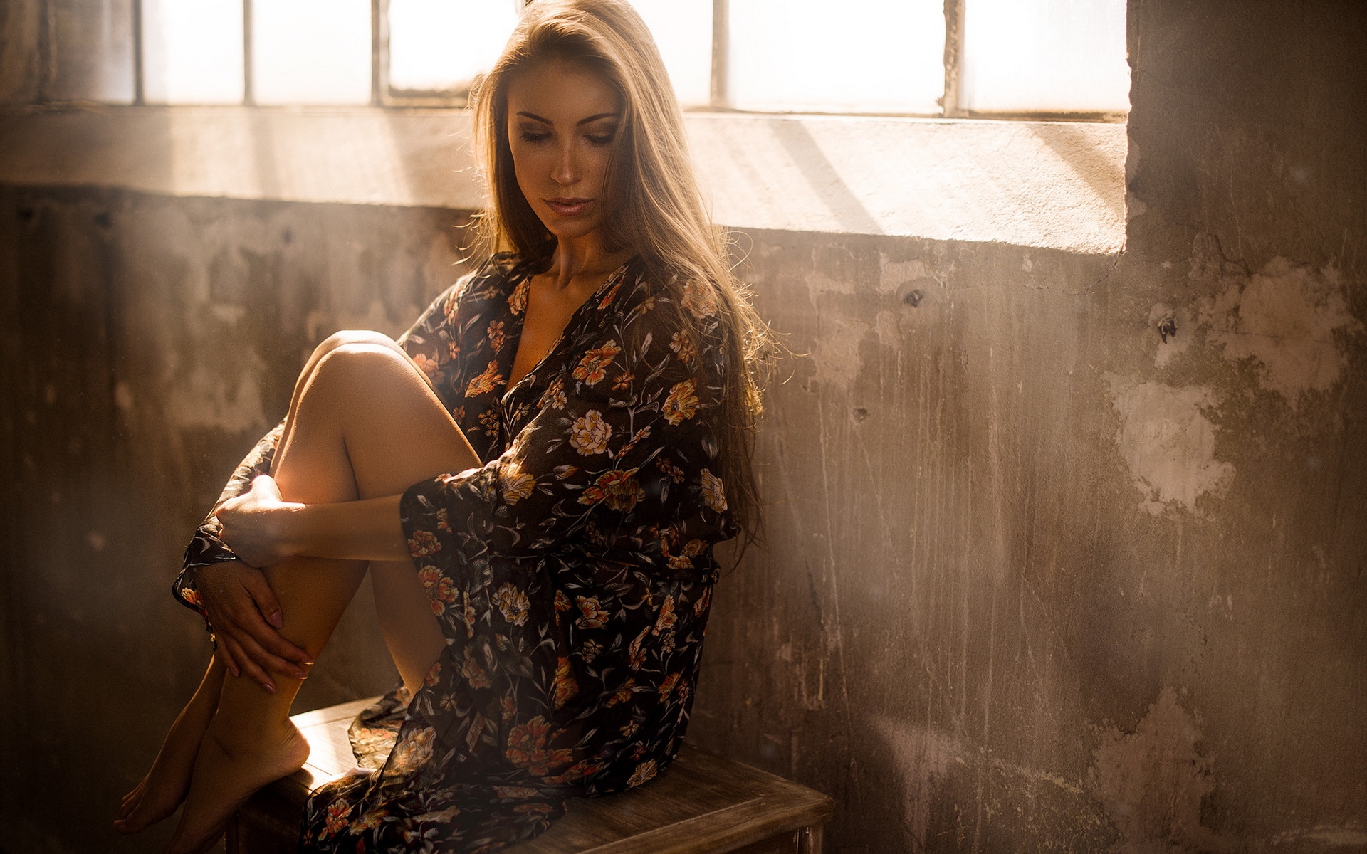 Description: A woman sitting on a bench in a room with a window behind her and a sun shining through the window.