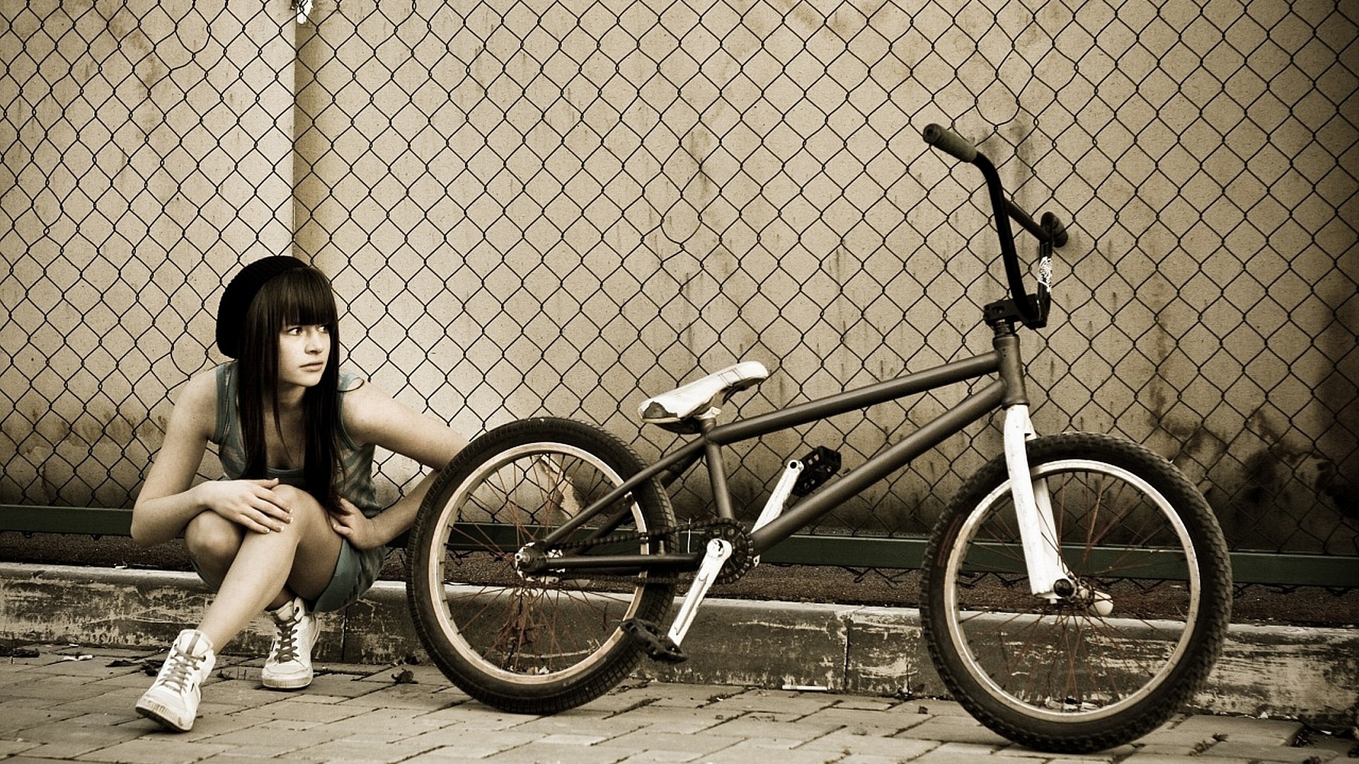 Description: A woman sitting next to a bike on a sidewalk next to a fence and a fence with a chain link fence.
