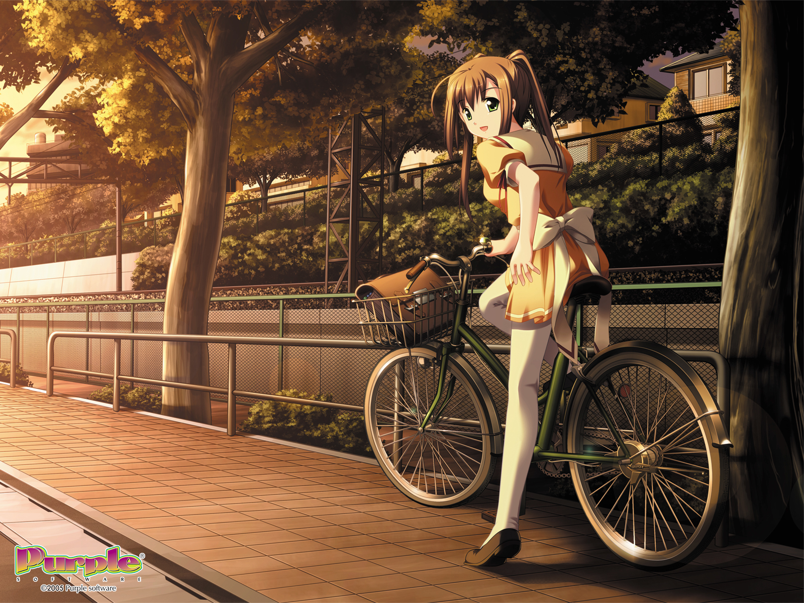 Description: A woman is riding a bike on a sidewalk near a fence and trees with a basket on the back.