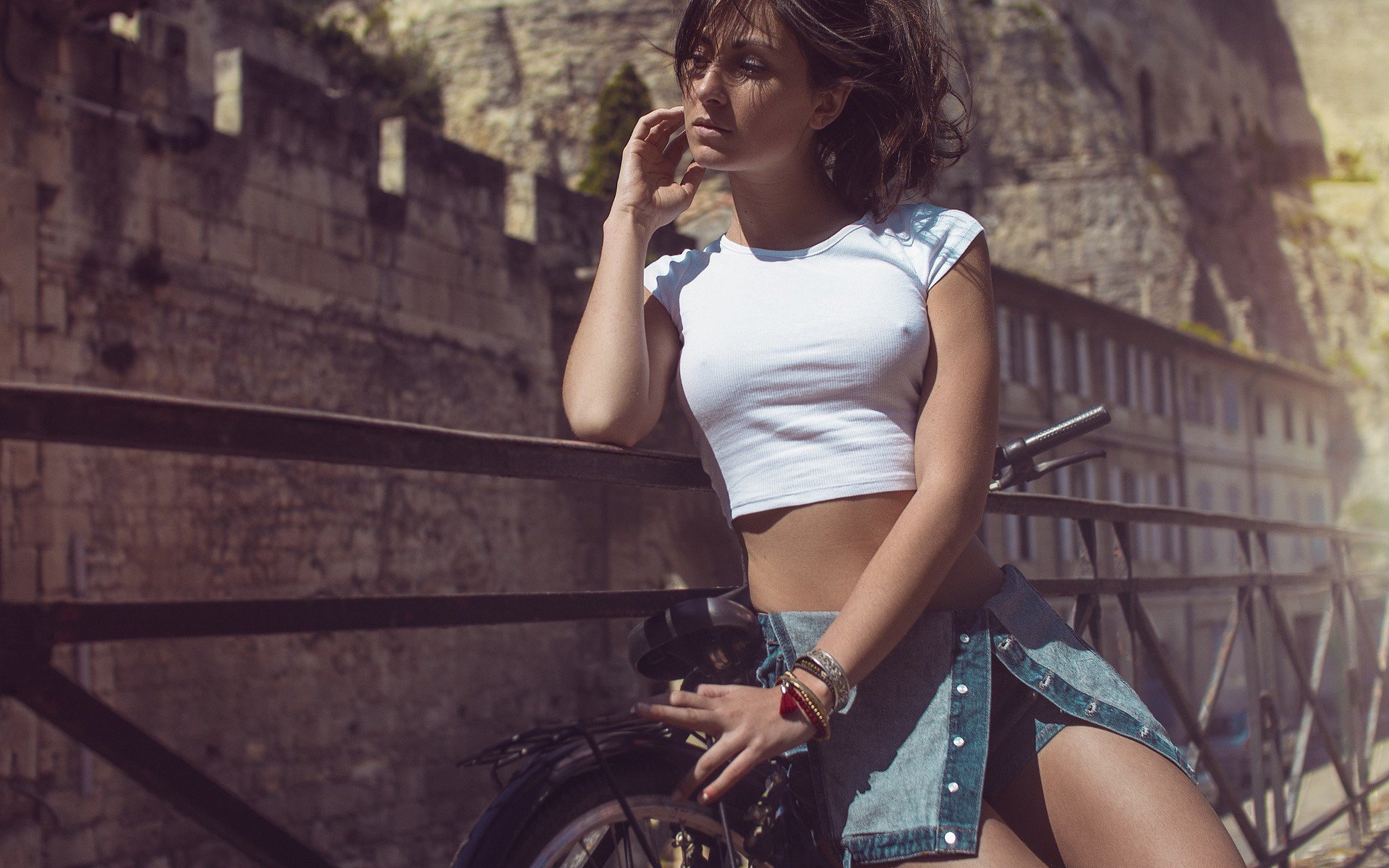 Description: A woman in a short skirt leaning on a bike leaning against a fence and posing for a picture with a bike behind her.