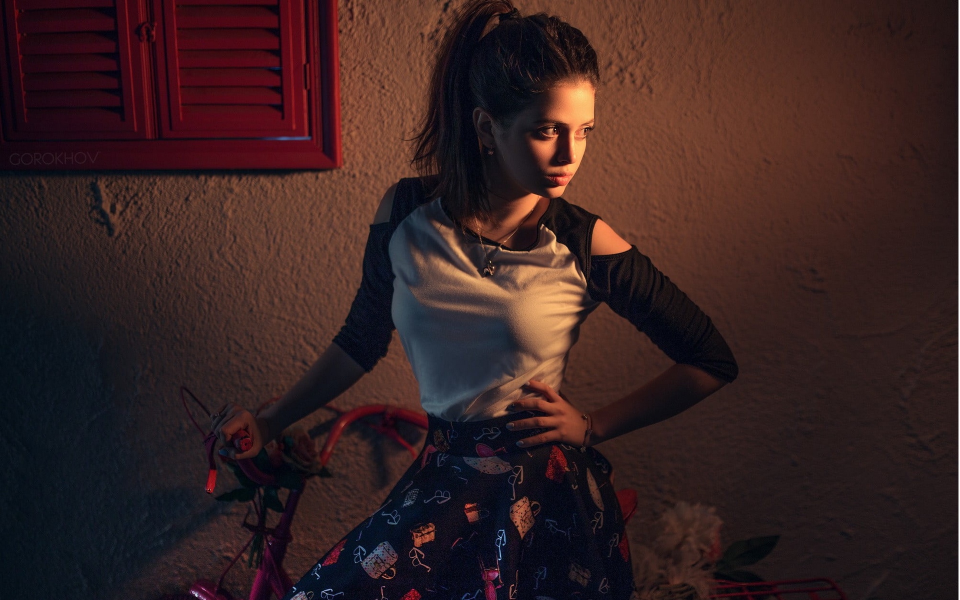 Description: A woman standing next to a bike in a room with a red shutter and a red window behind her.