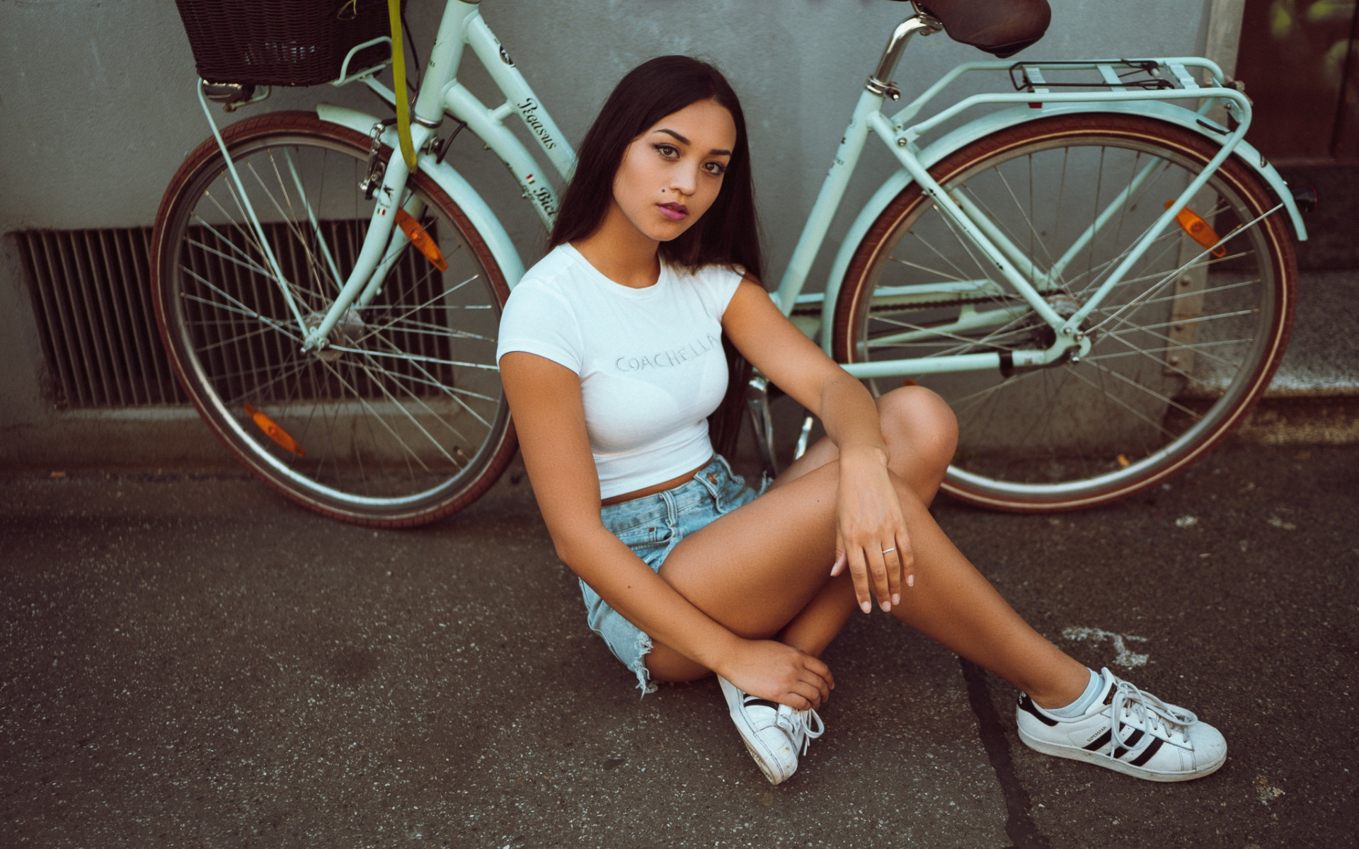 Description: A woman sitting on the ground next to a bike and a bicycle rack with a bicycle behind her on a city street.