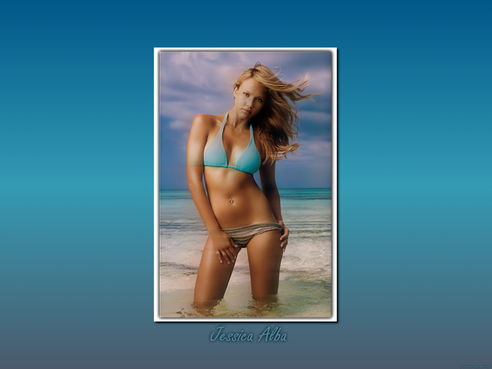 Description: A woman in a bikini standing in the water at the beach with her hair blowing in the wind and a blue sky.