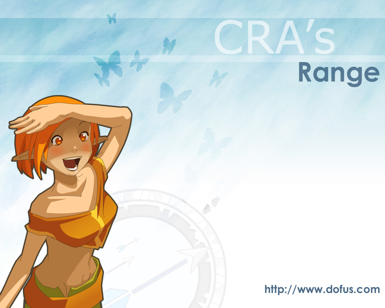 Description: A woman in a bikini standing in front of a blue sky with butterflies on it and the words cra's range below her.