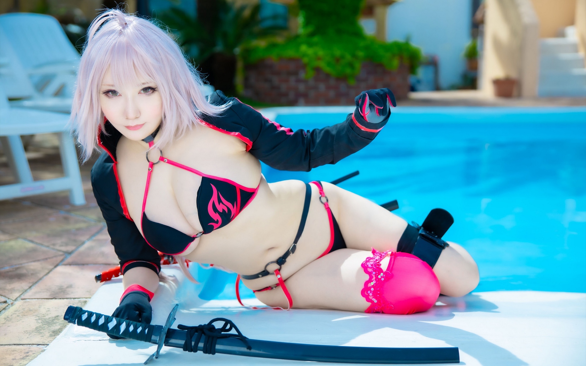 Description: A woman in a bikini and boots sitting on a pool edge with a sword in her hand and a pool in the background.