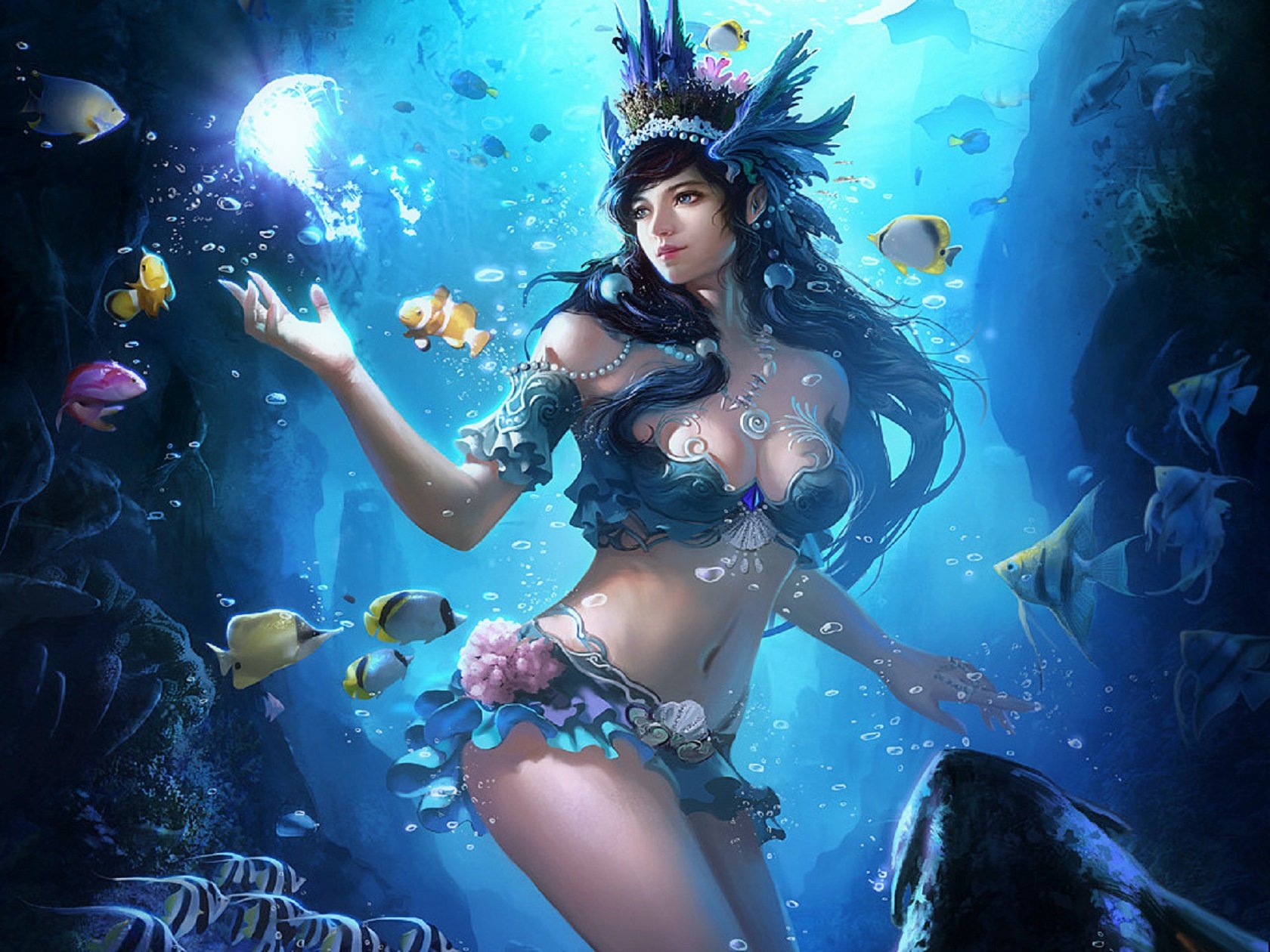 Description: A woman in a bikini holding a crystal ball in a underwater scene with fish and corals on the bottom.