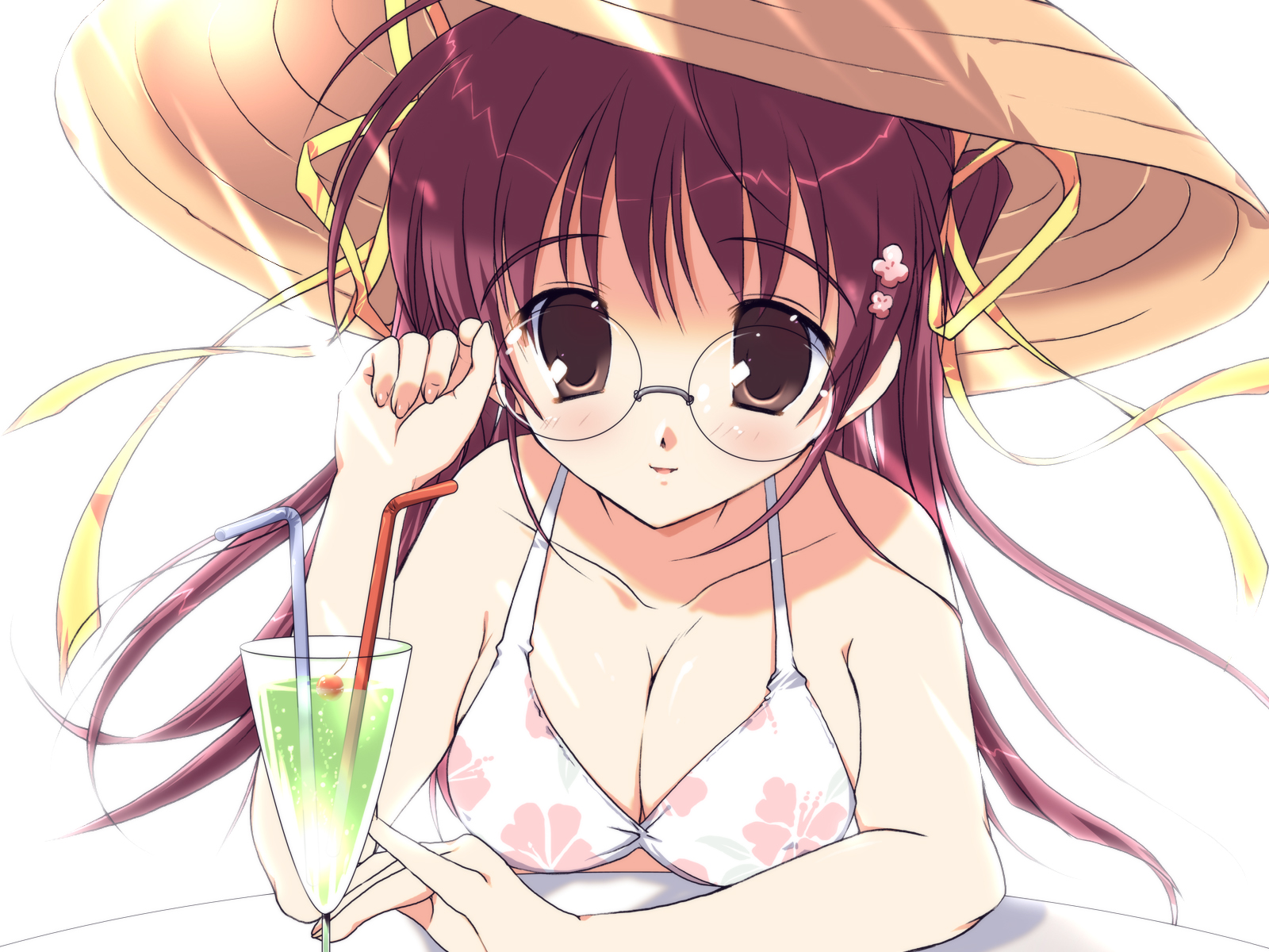 Description: A woman in a bikini holding a drink and a straw hat on her head.