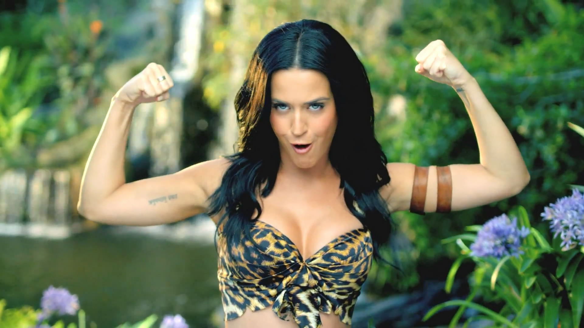 Description: A woman in a bikini top posing for a picture with her arms up and her hands in the air.