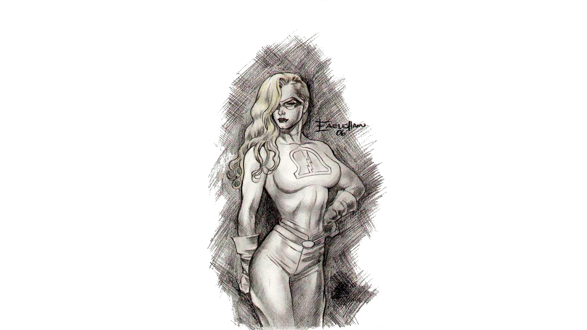 Description: A drawing of a woman in a bikini with her hands on her hips and her right hand on her hip.
