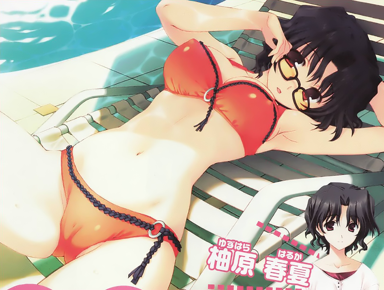 Description: A woman in a bikini laying on a bench next to a man in a white shirt and glasses.