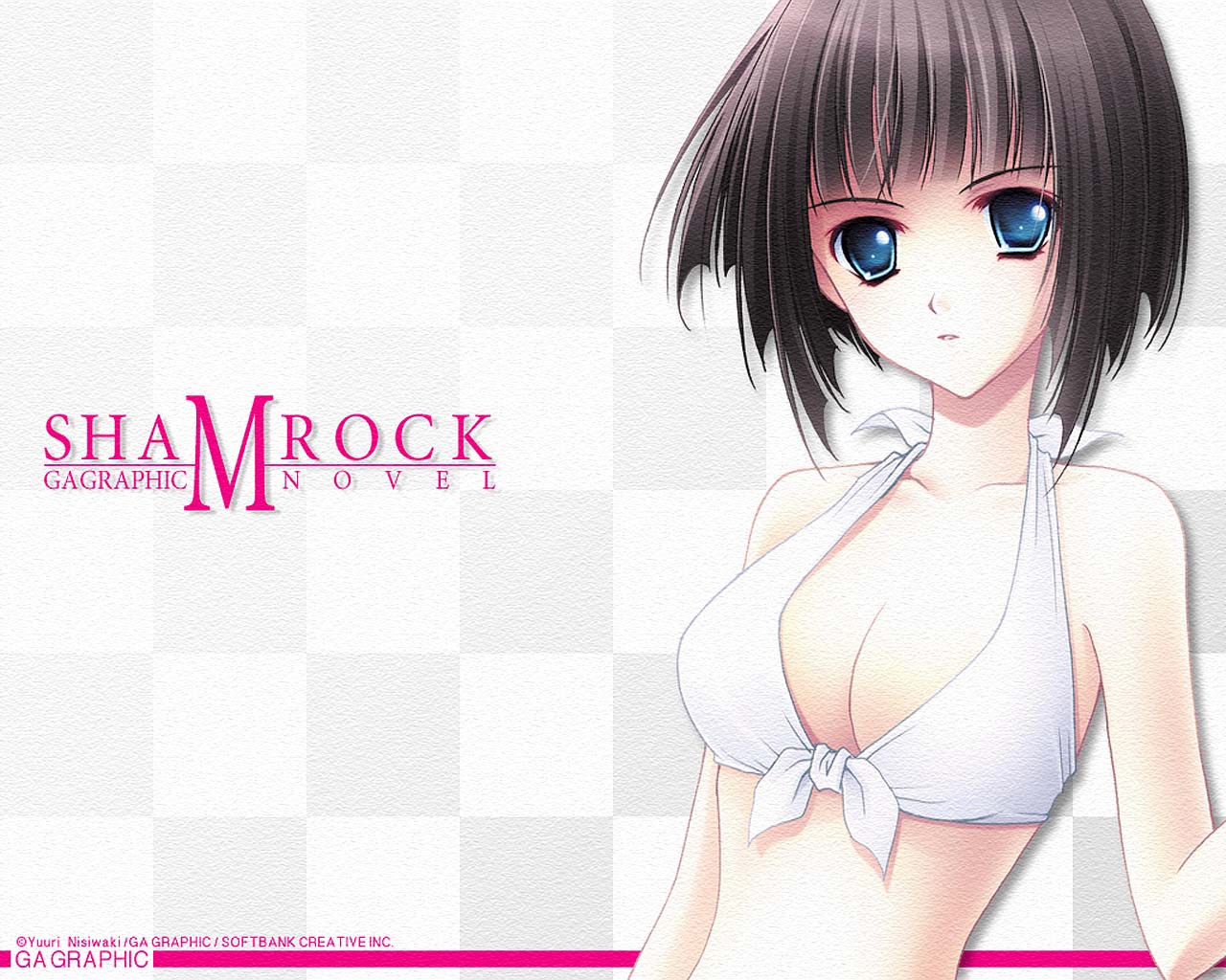 Description: A woman in a bikini with a white background and a pink border around her neck and chest.