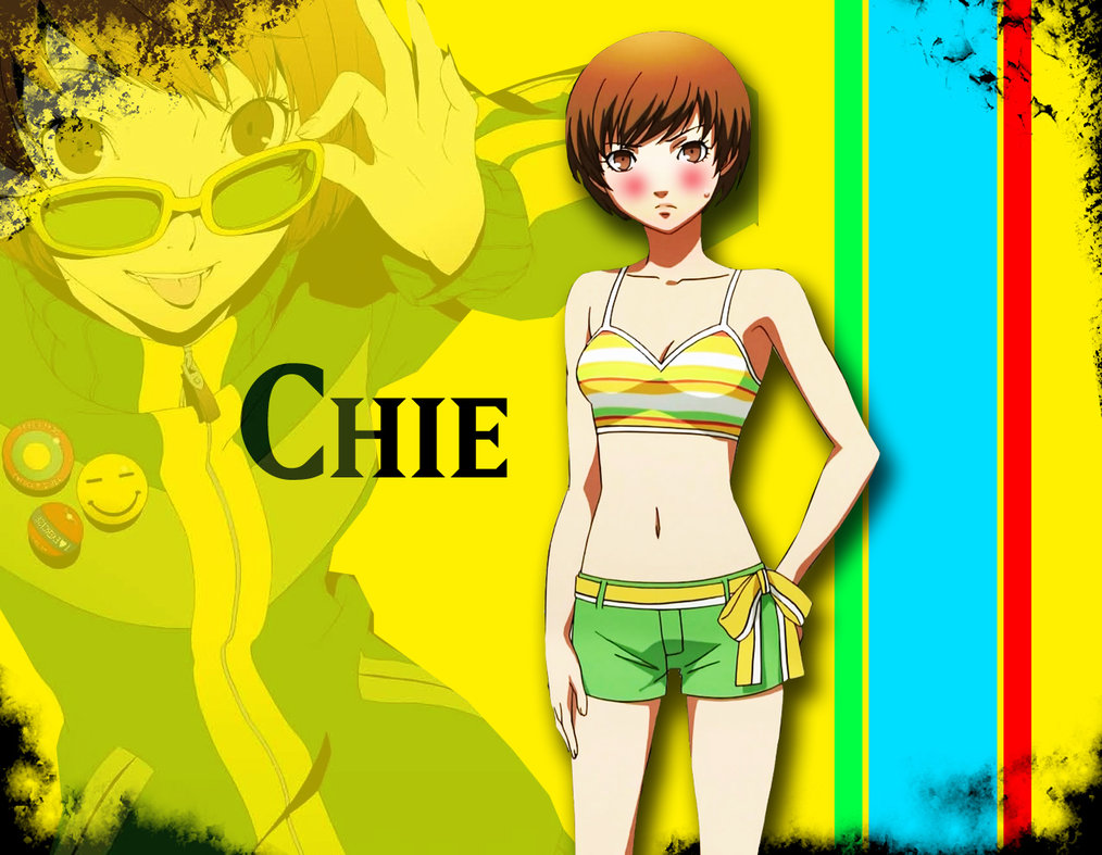 Description: A woman in a bikini top and shorts standing next to a rainbow colored background with a cartoon character in the background.