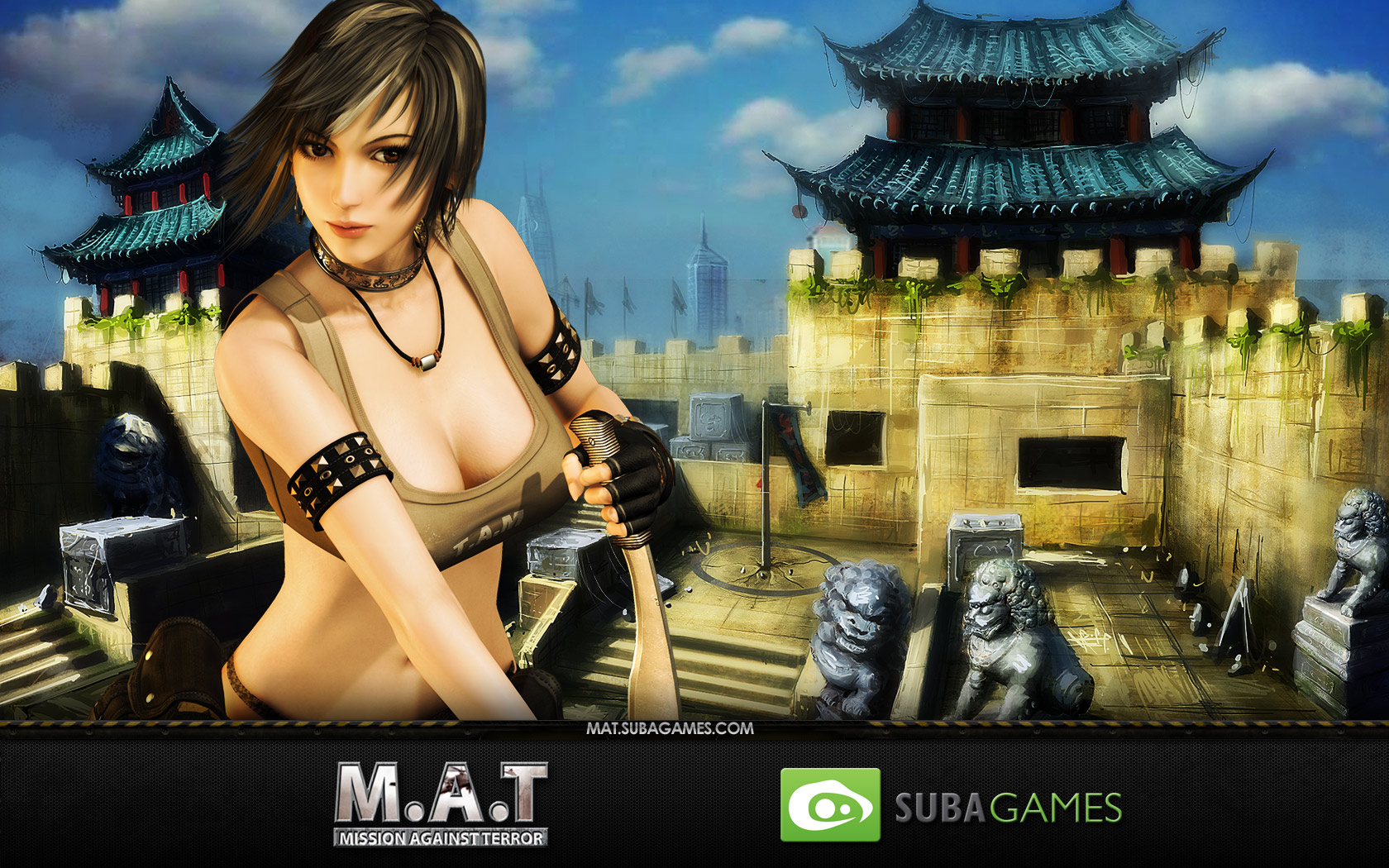Description: A woman in a bikini holding a sword in front of a castle with a statue of a woman in the background.