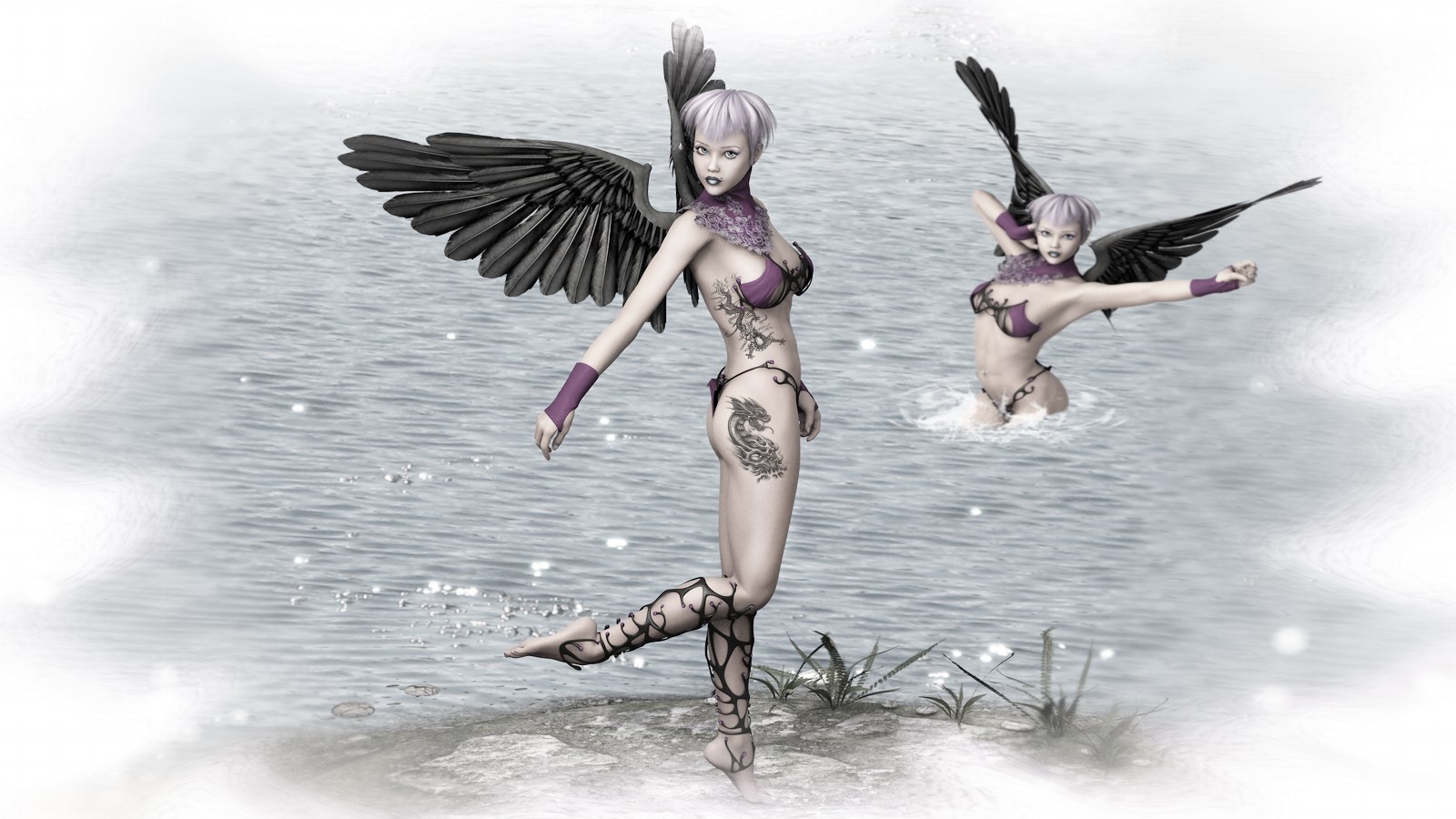 Description: A woman in a bikini with wings flying over her head and body in the water.