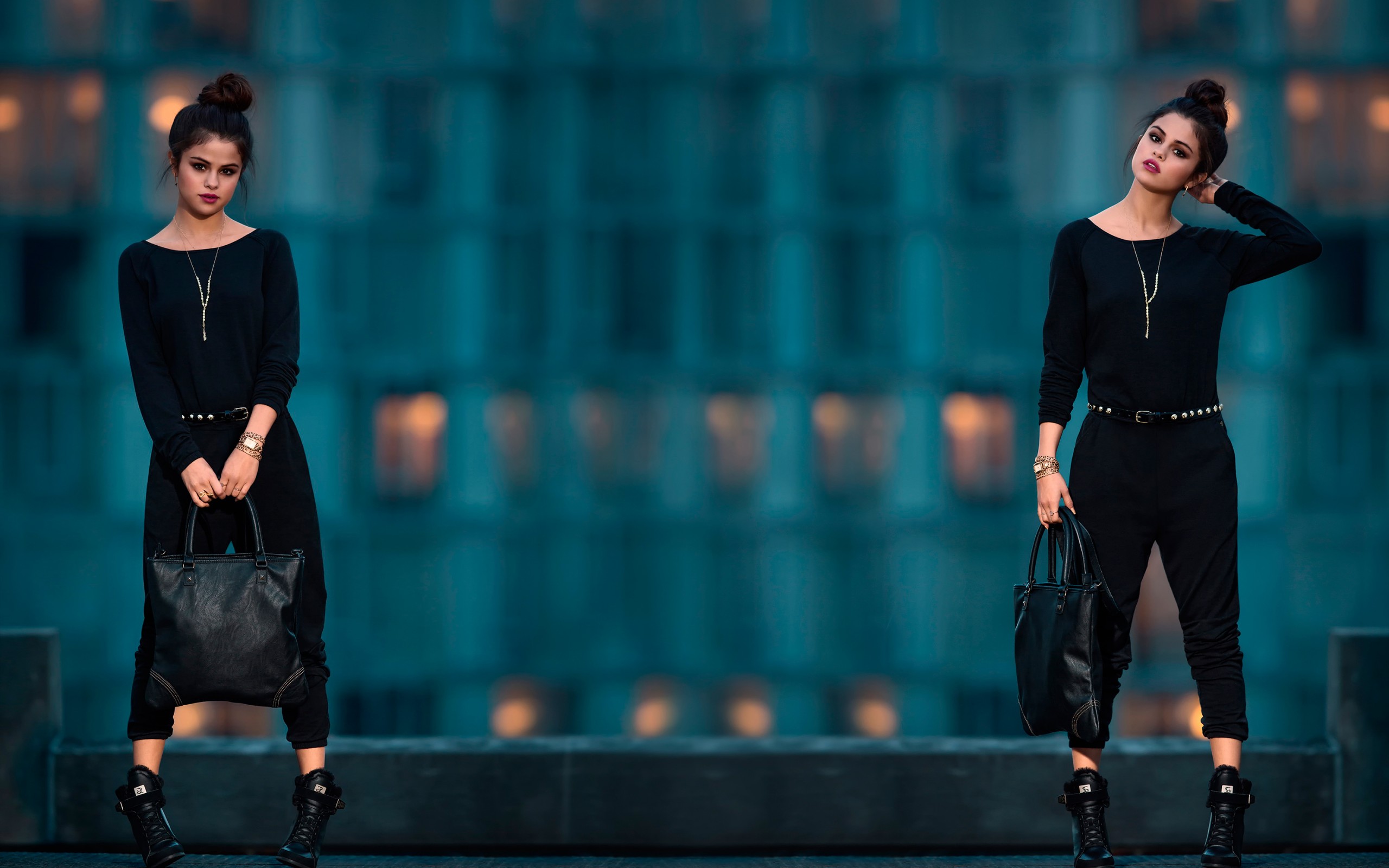 Description: A woman in black is holding a black bag and posing for a picture in front of a building with a black purse.