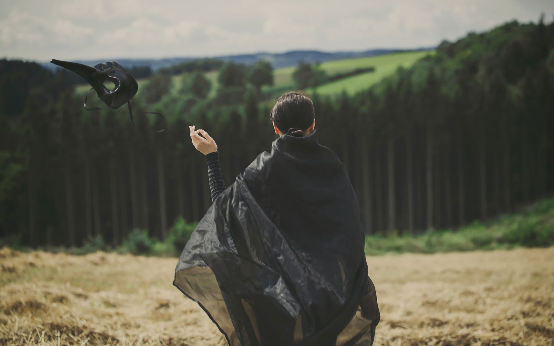 Description: A woman in a black cape flying a black bird in a field of grass and trees in the background.