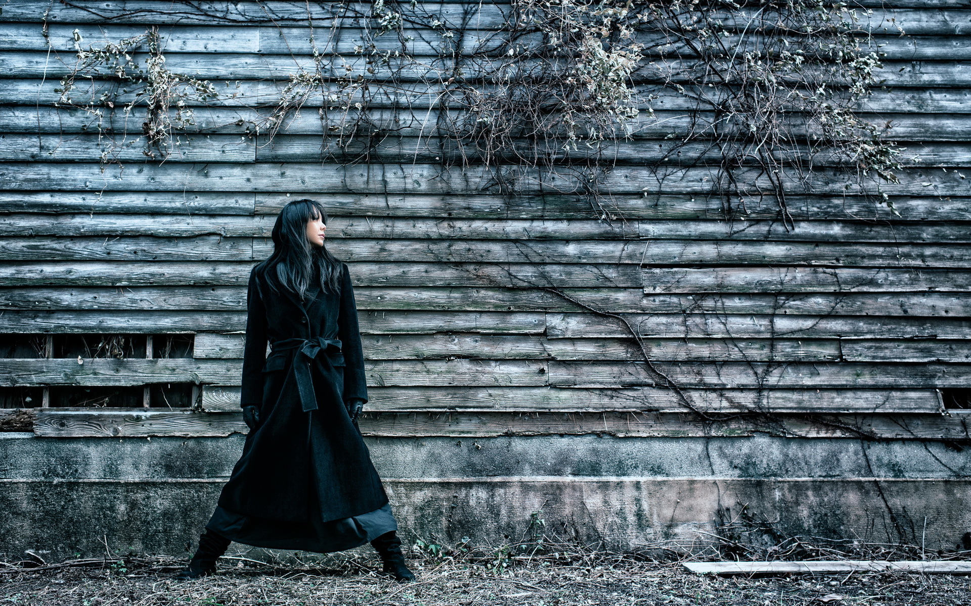 Description: A woman in a long black coat walking by a building with a tree in the background and a fence.