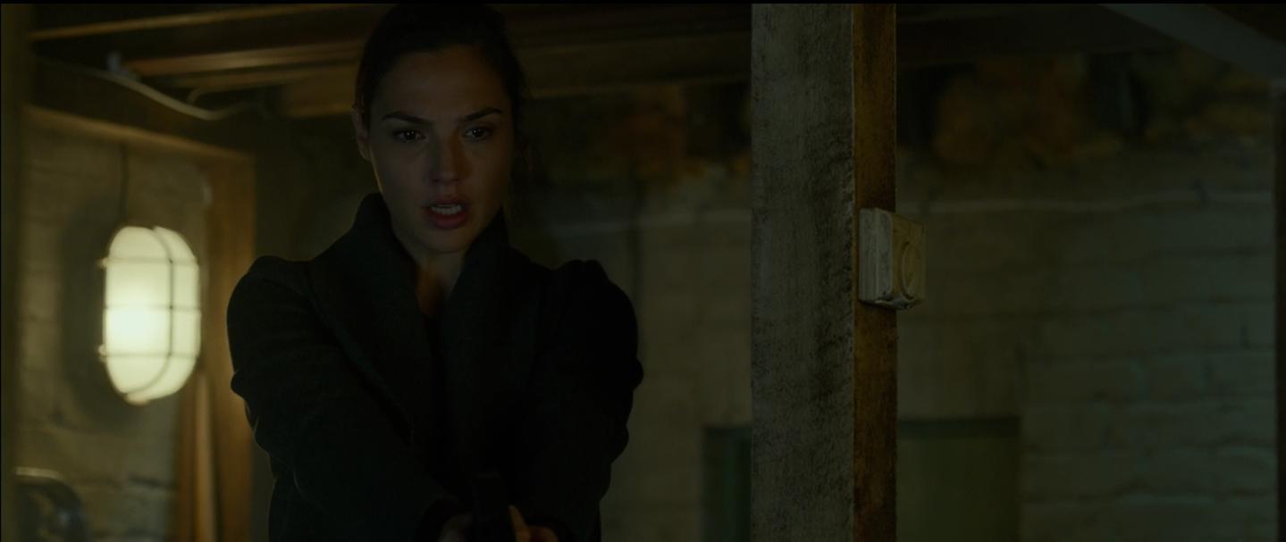 Description: A woman in a black coat holding a gun in a room with a brick wall and a window in the background.