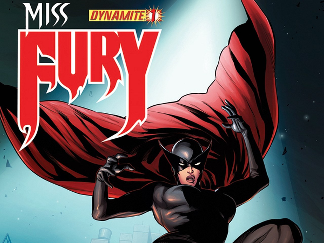 Description: A woman in a black costume is flying through the air with a red cape on her head and a red cape on her head.