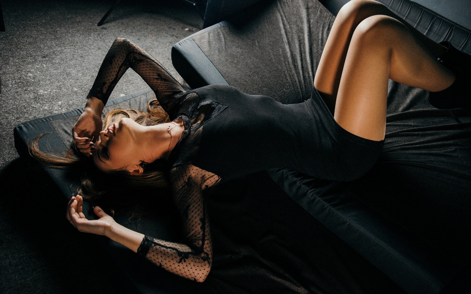 Description: A woman laying on a black couch with her legs crossed and her head resting on her handbag.