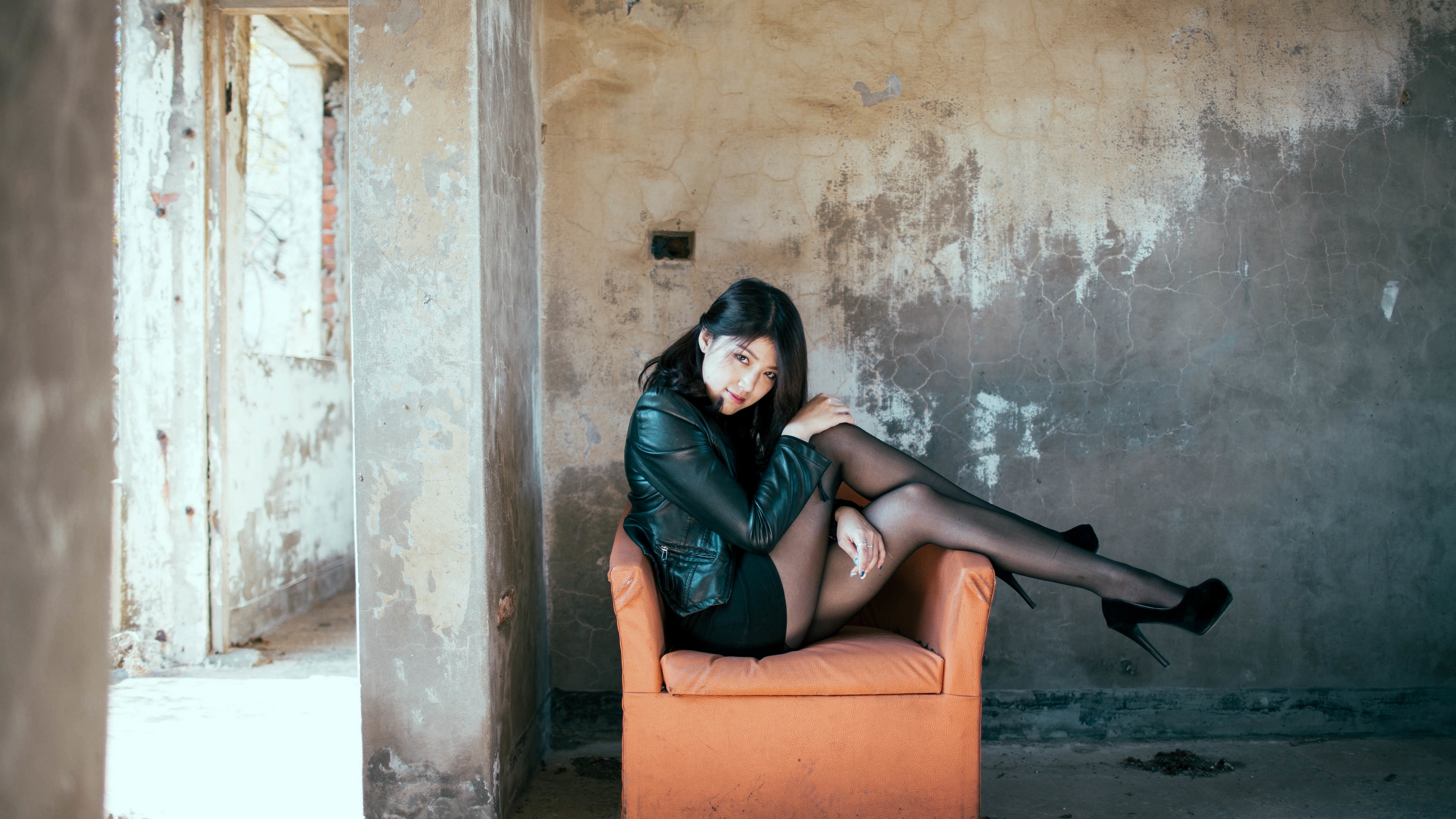 Description: A woman in a black dress and black boots sitting on a chair in a room with a wall and a window.