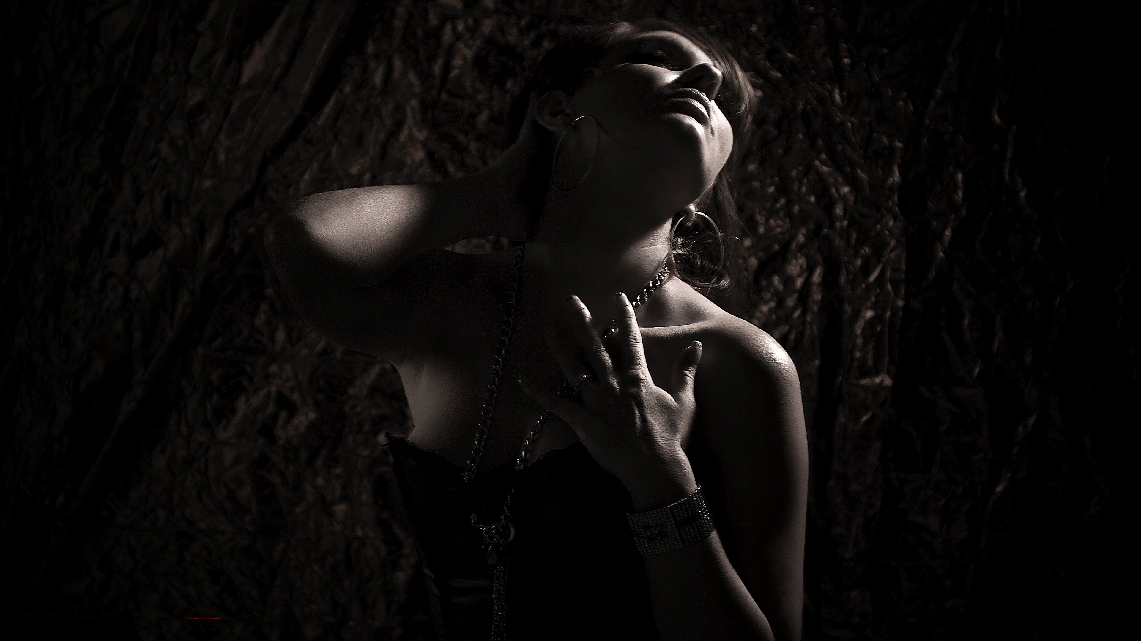 Description: A woman in a black dress is holding a chain around her neck and looking up at the sky with her eyes closed.